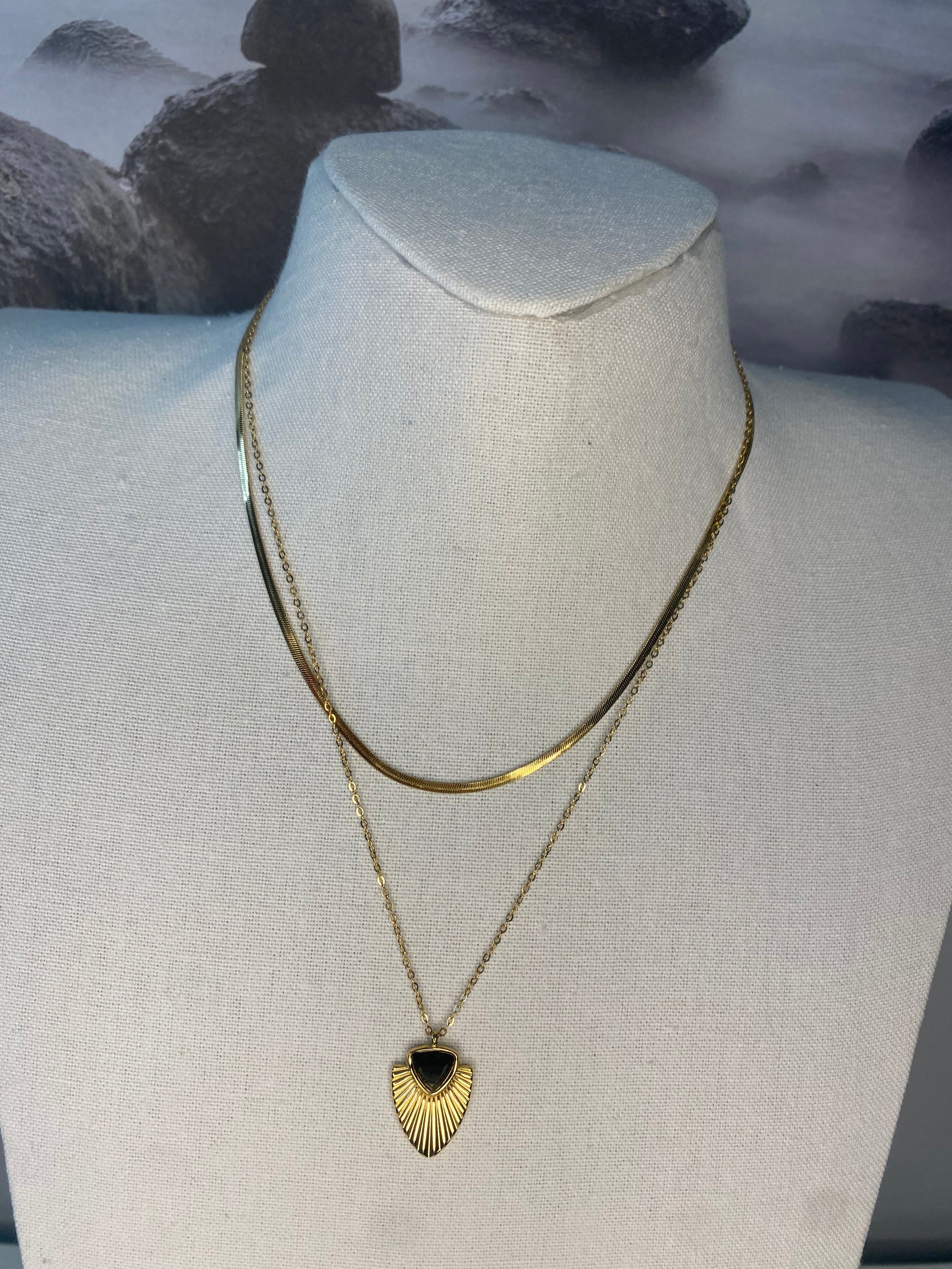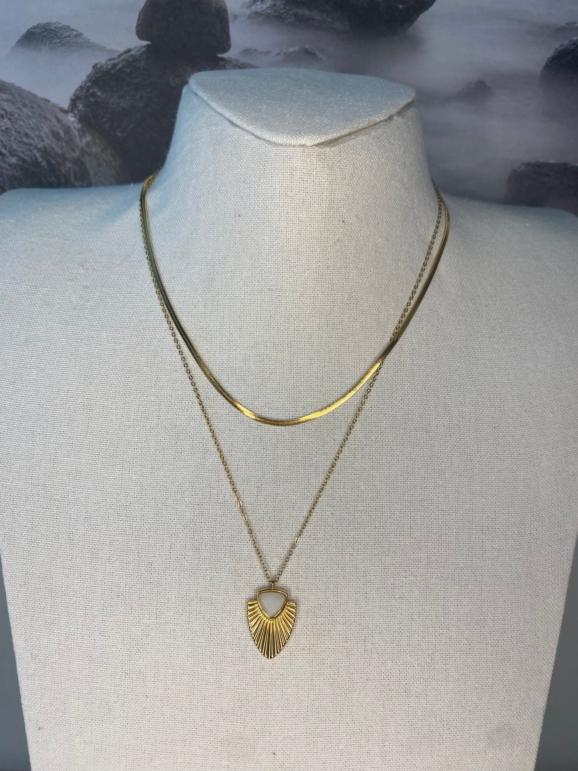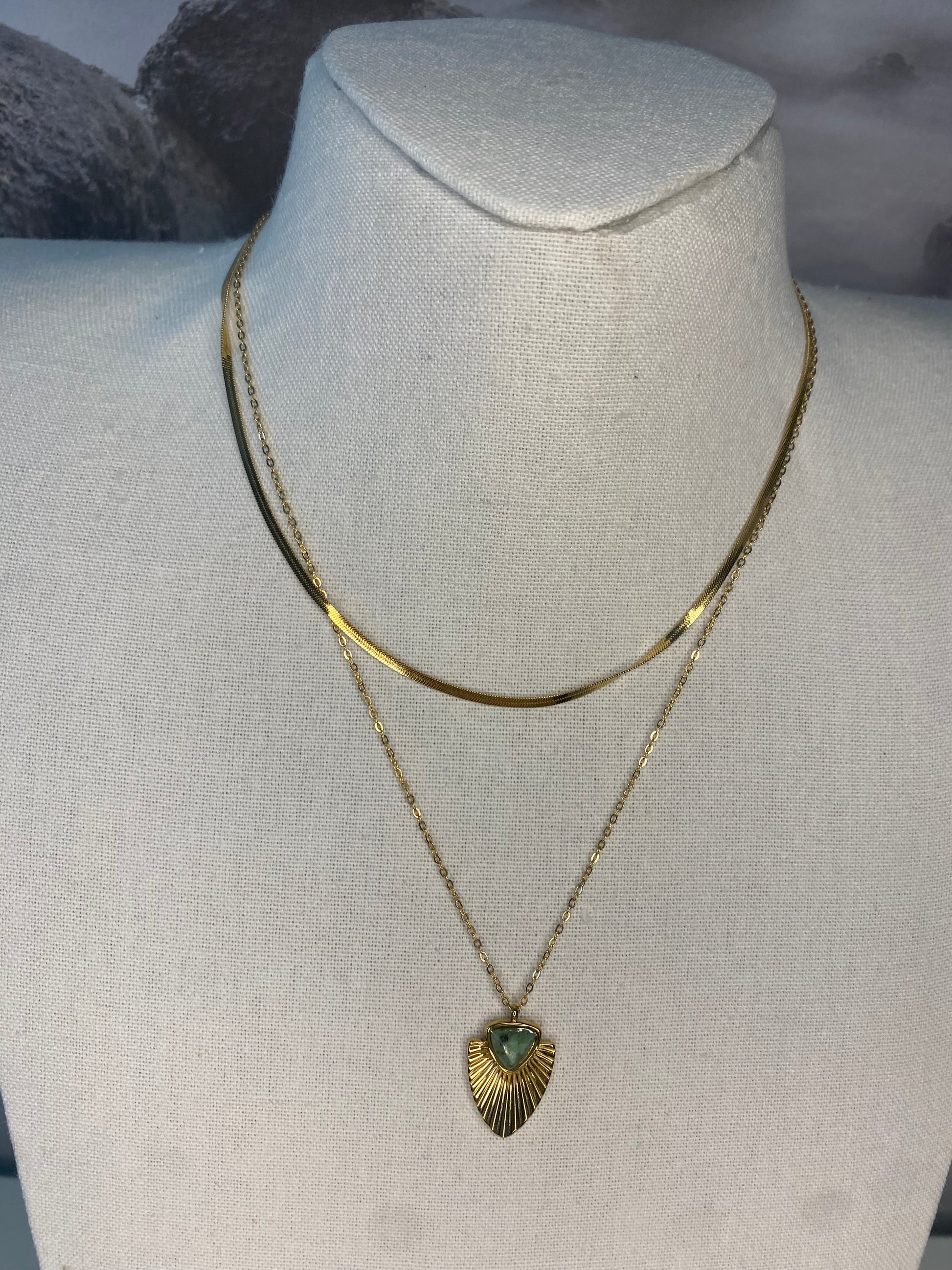 Collier double rangs composé d’une fine chaîne plate et d’une chaîne avec pendentif façon feuille de palmier avec une pierre naturelle triangulaire.