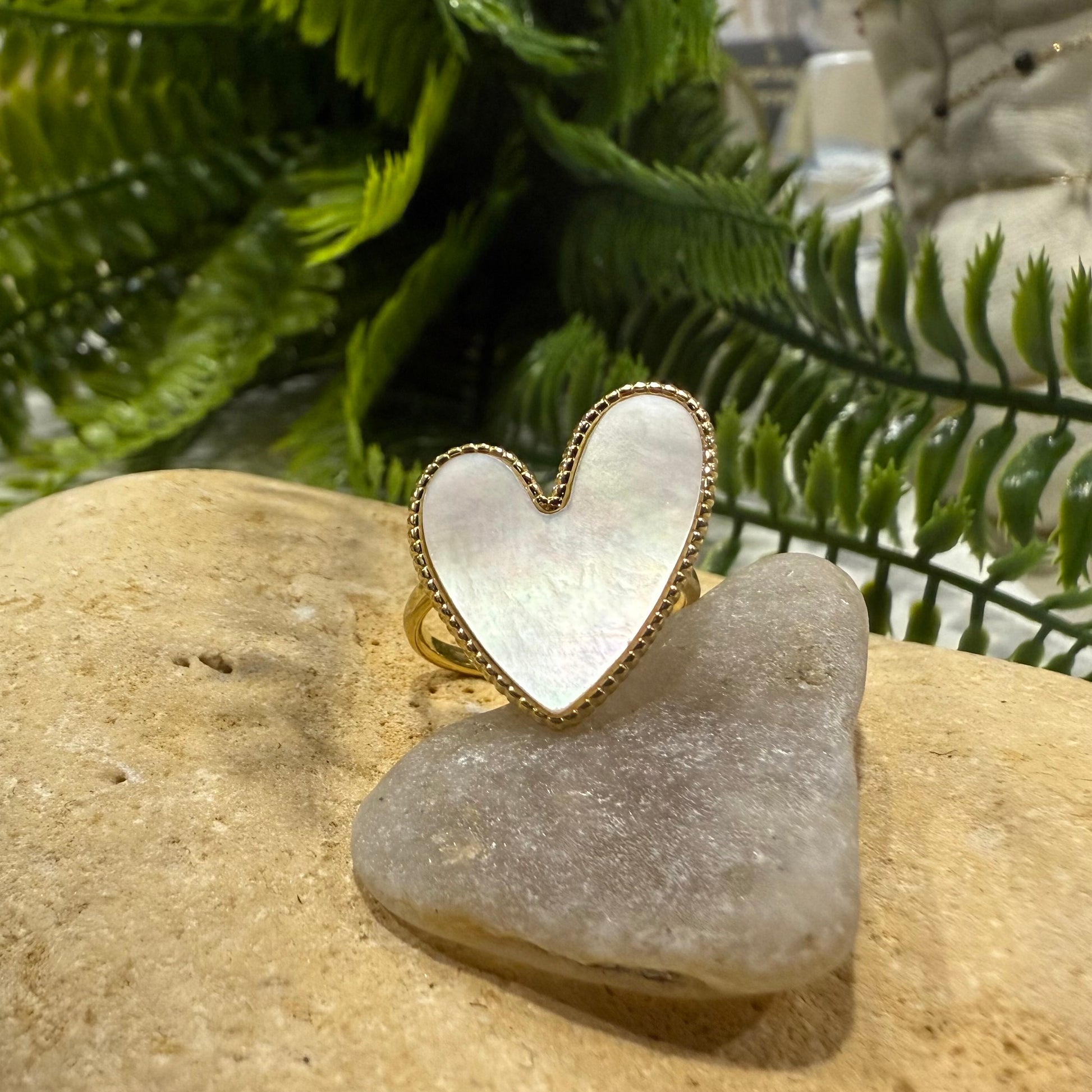 La bague Ely blanche est faite de nacre.