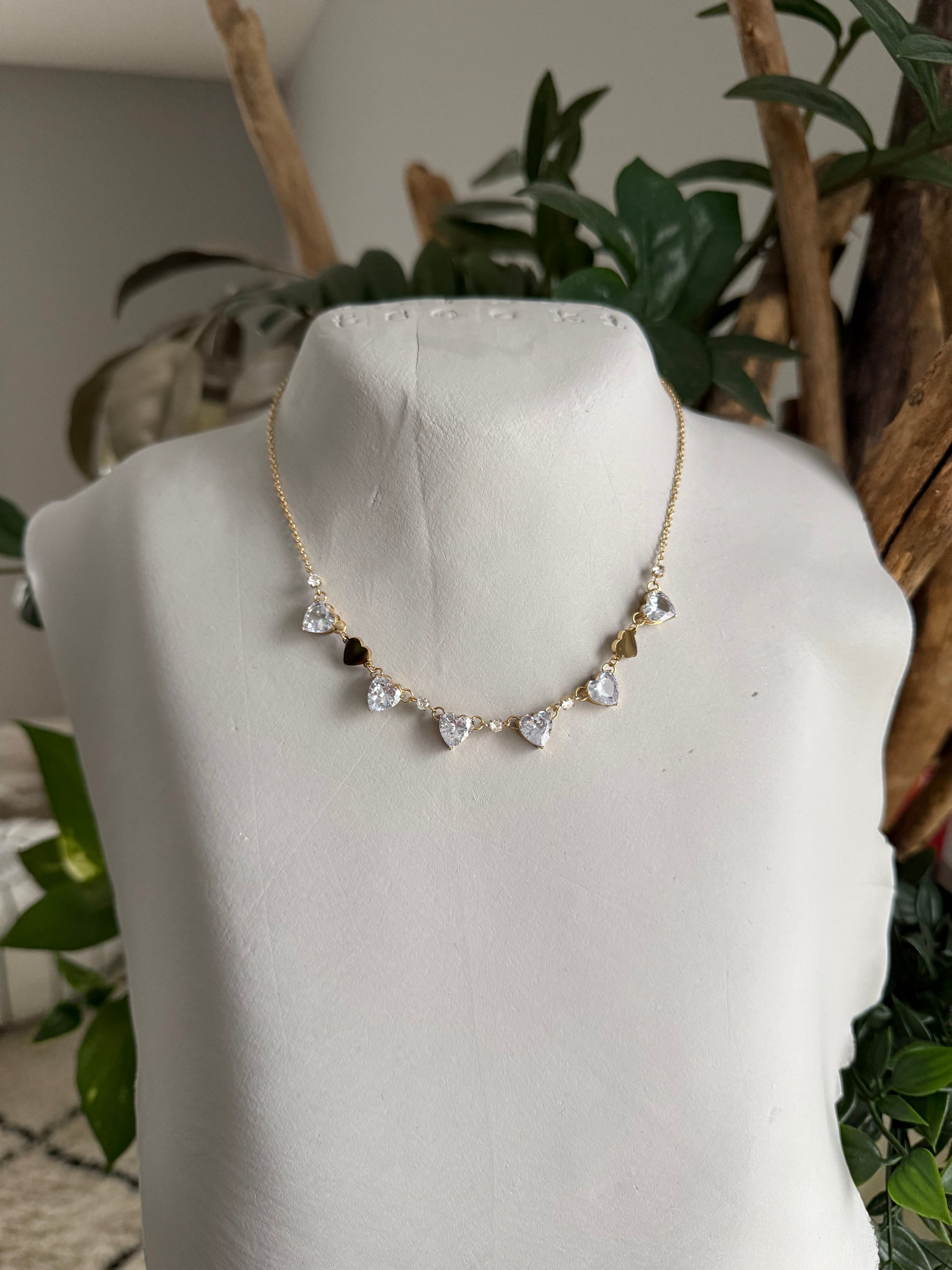 Collier serti de 6 cœurs en strass blancs, ainsi que 6 petits strass blancs.