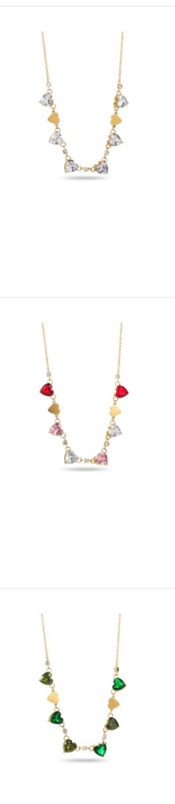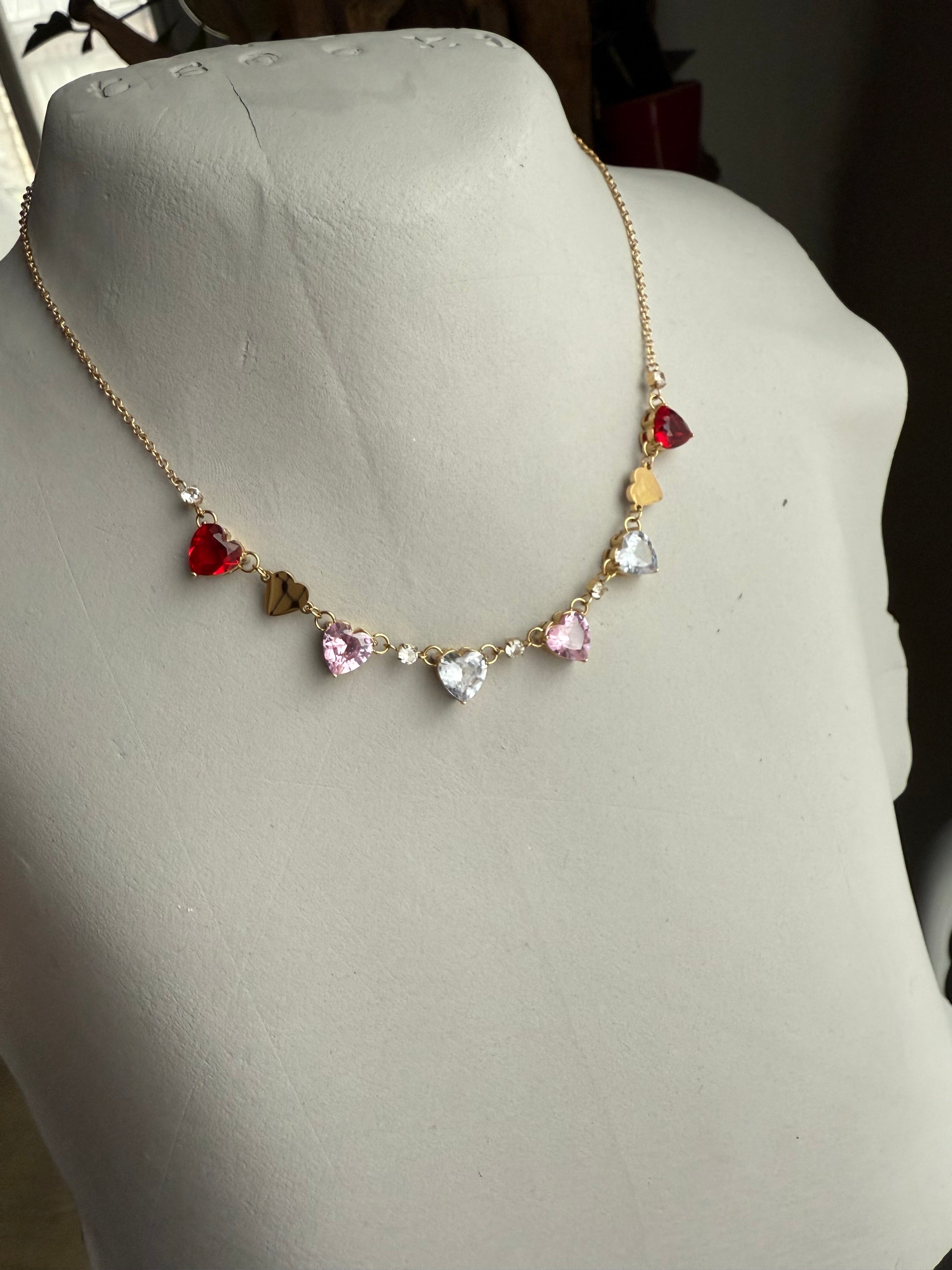 Collier serti de 6 cœurs en strass en camaïeu de rouge et rose, ainsi que 6 petits strass blancs.