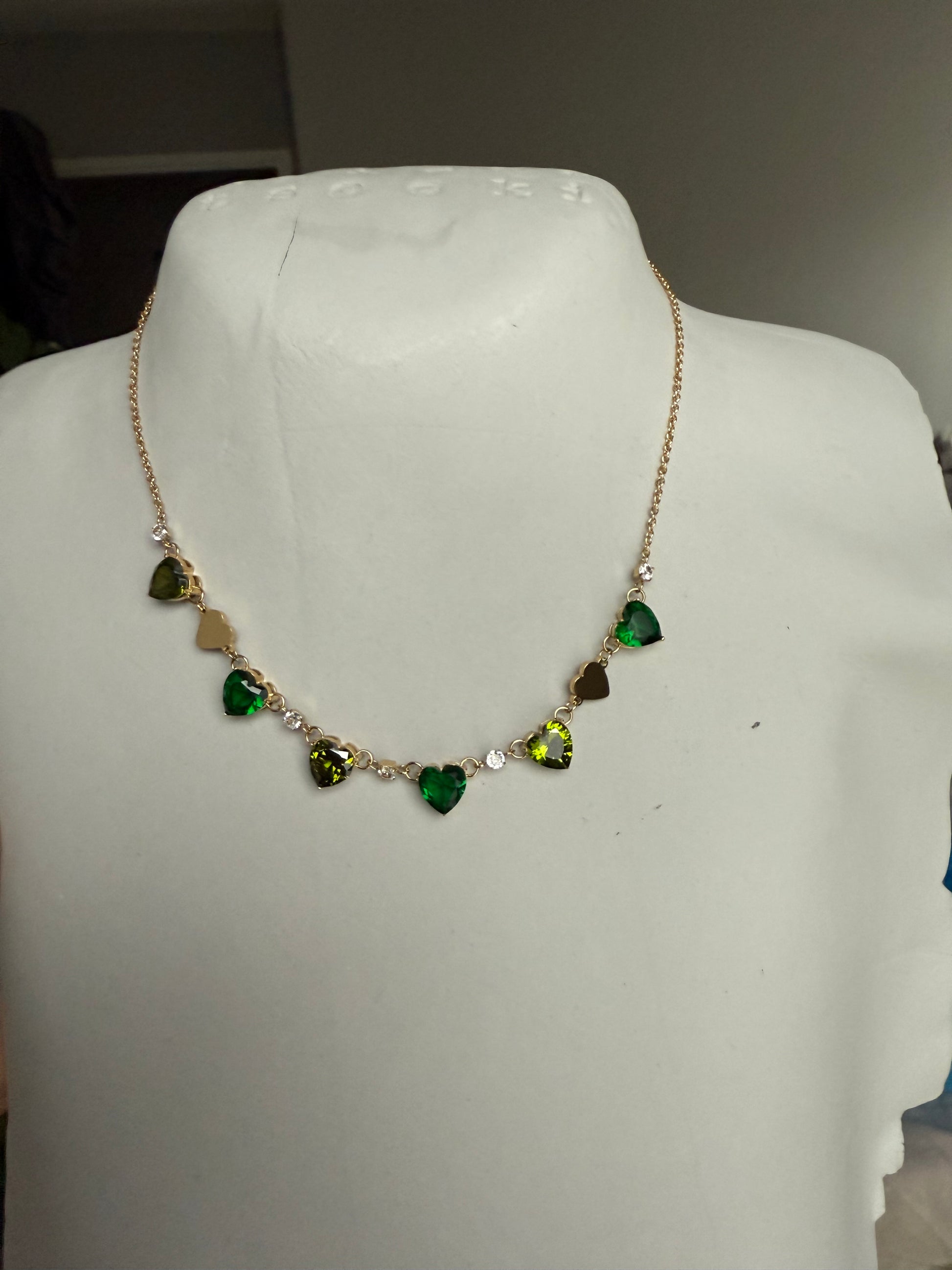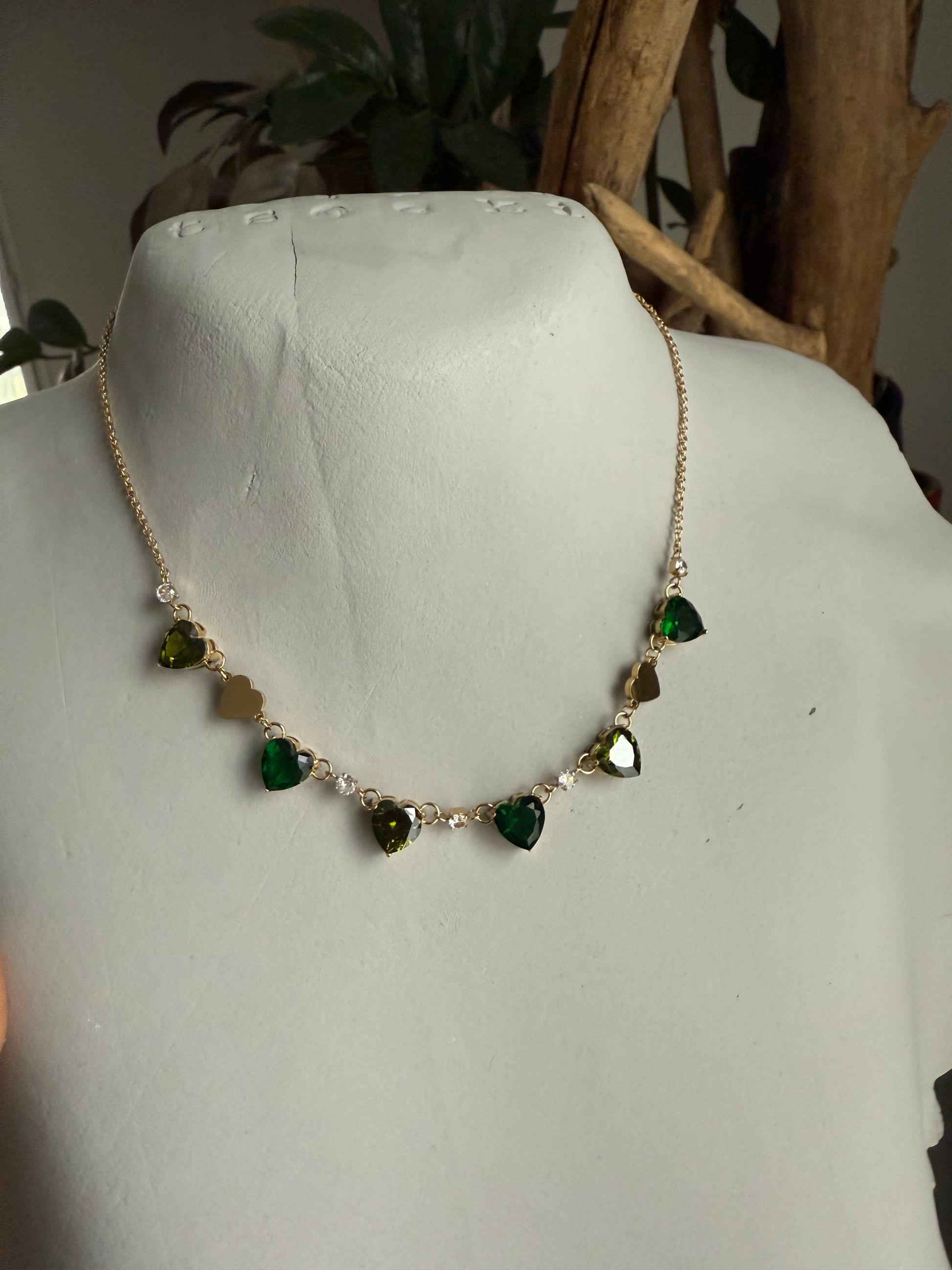 Collier serti de 6 cœurs en strass en camaïeu de verts, ainsi que 6 petits strass blancs.