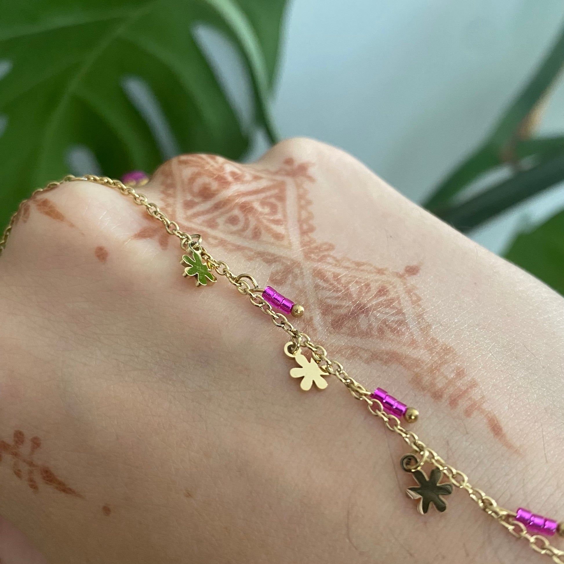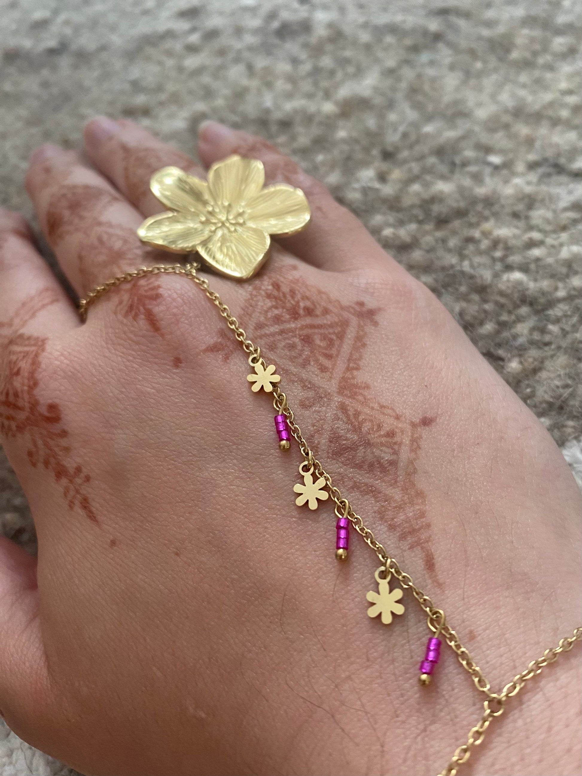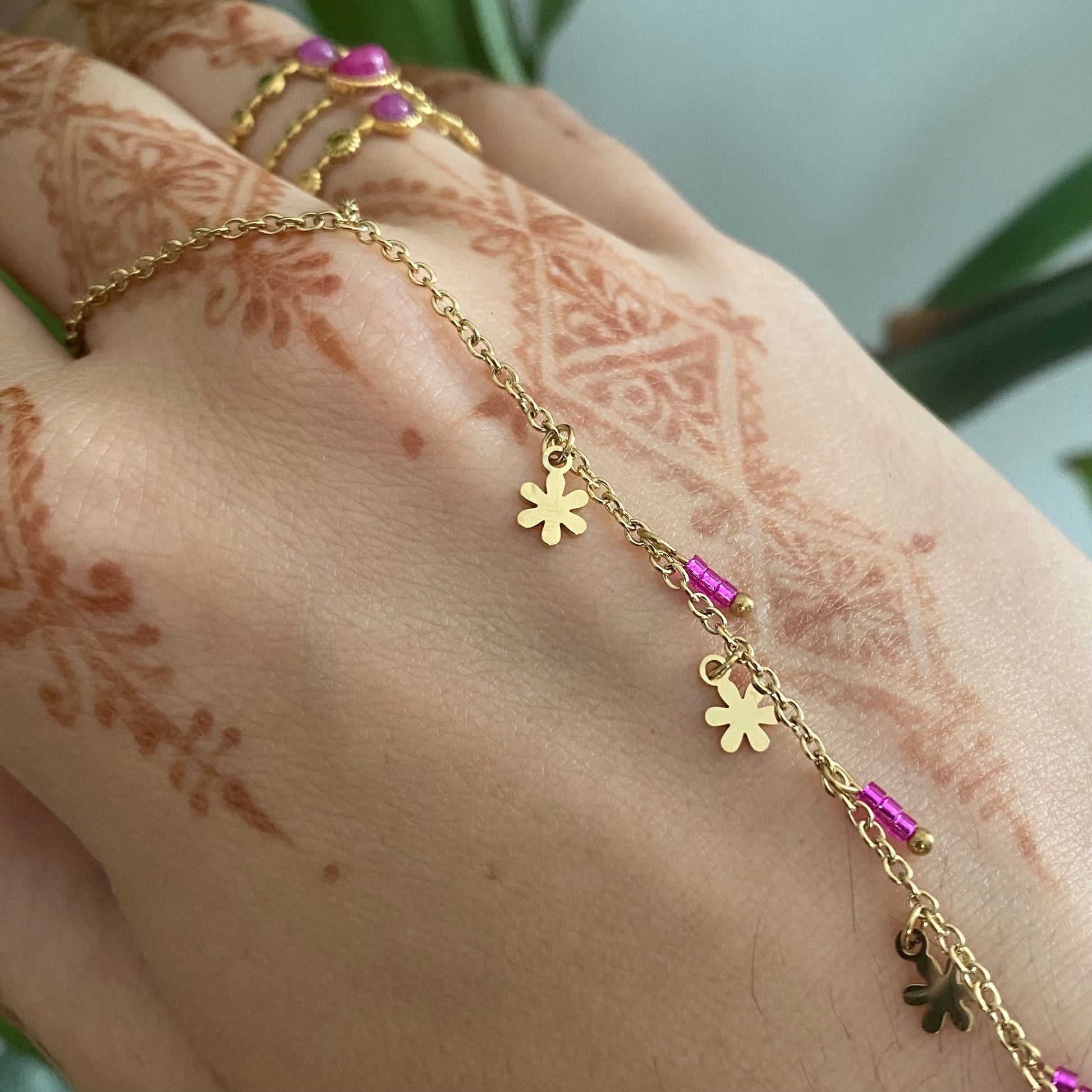 Bijou de main en acier inoxydable embelli par des fleurs dorées et perles roses.