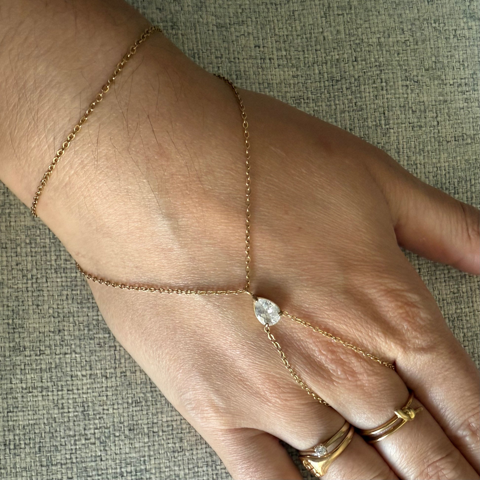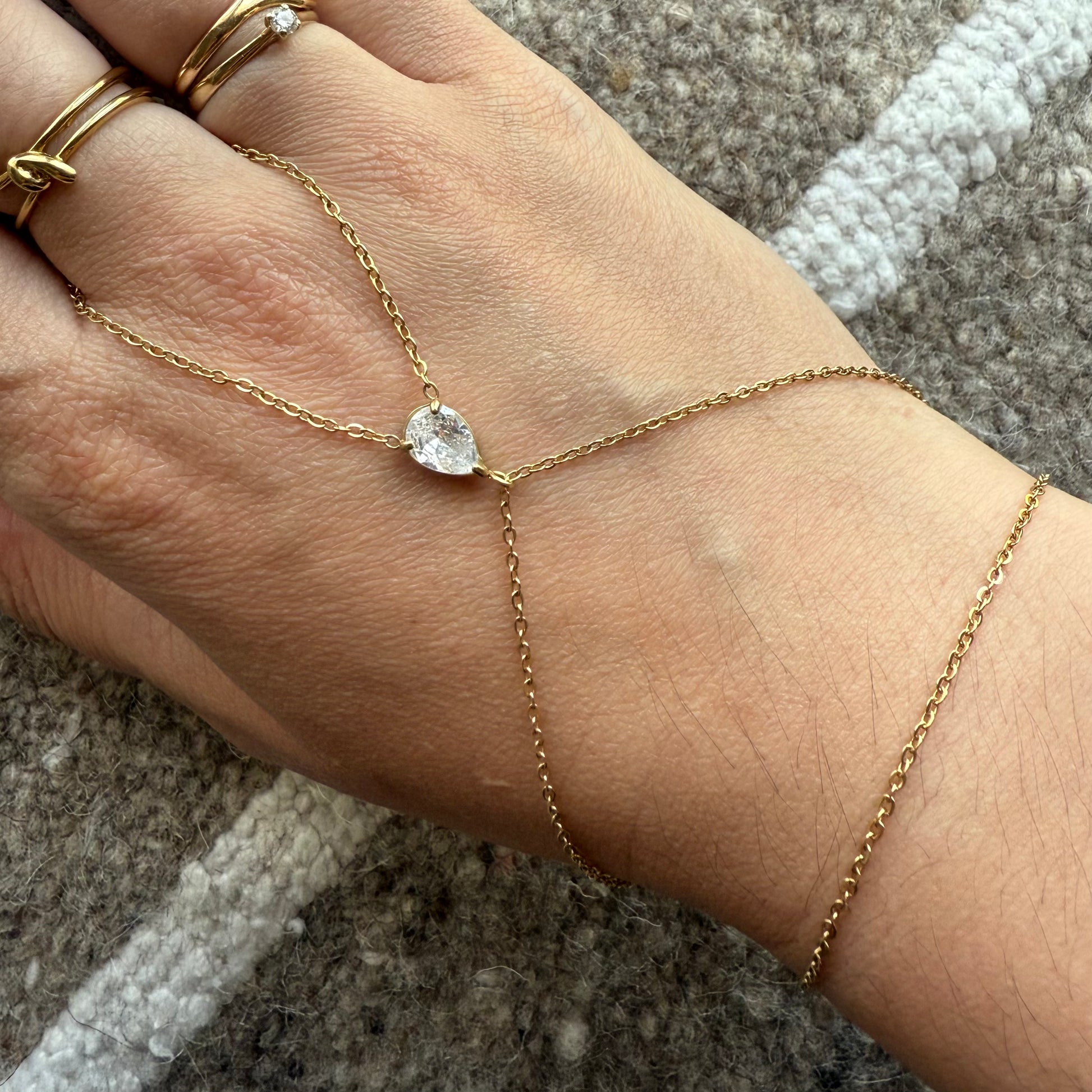 Bijou de main en acier inoxydable embelli par un strass en forme de goutte.