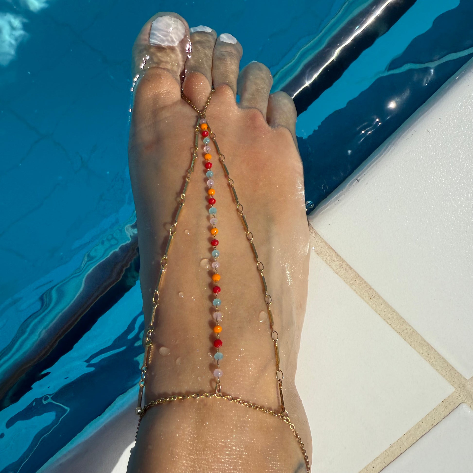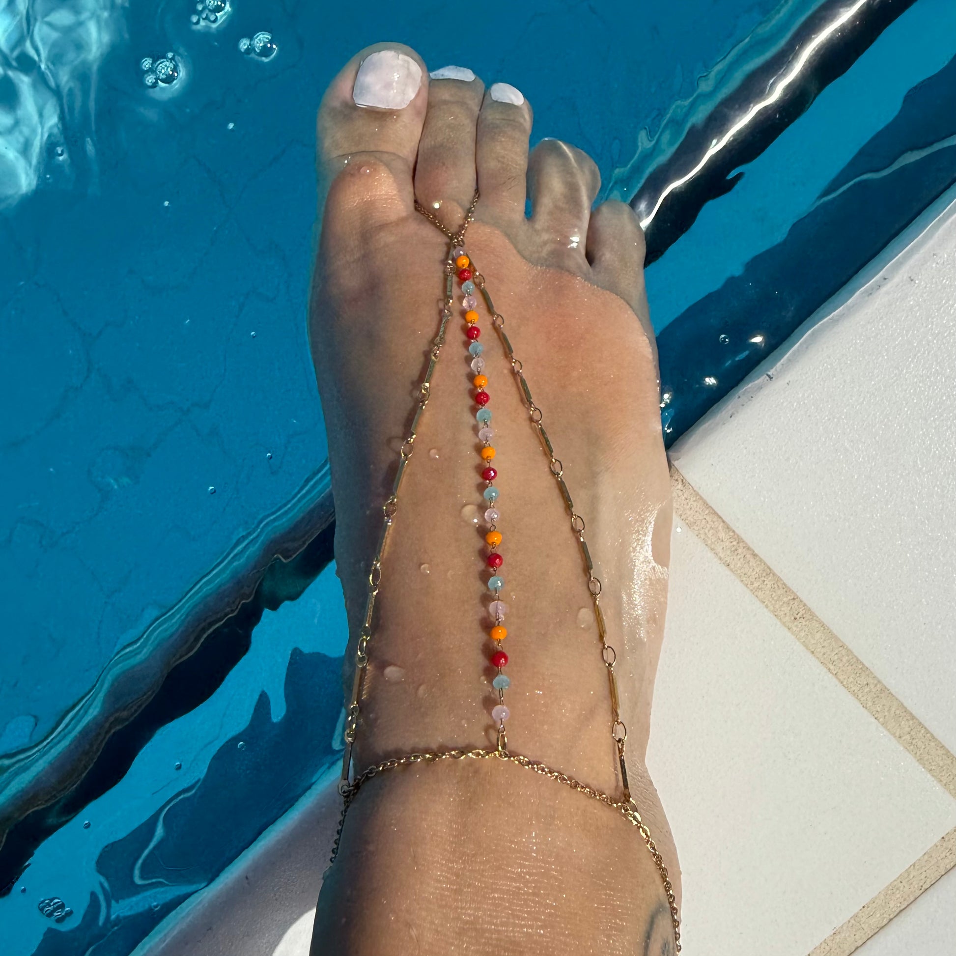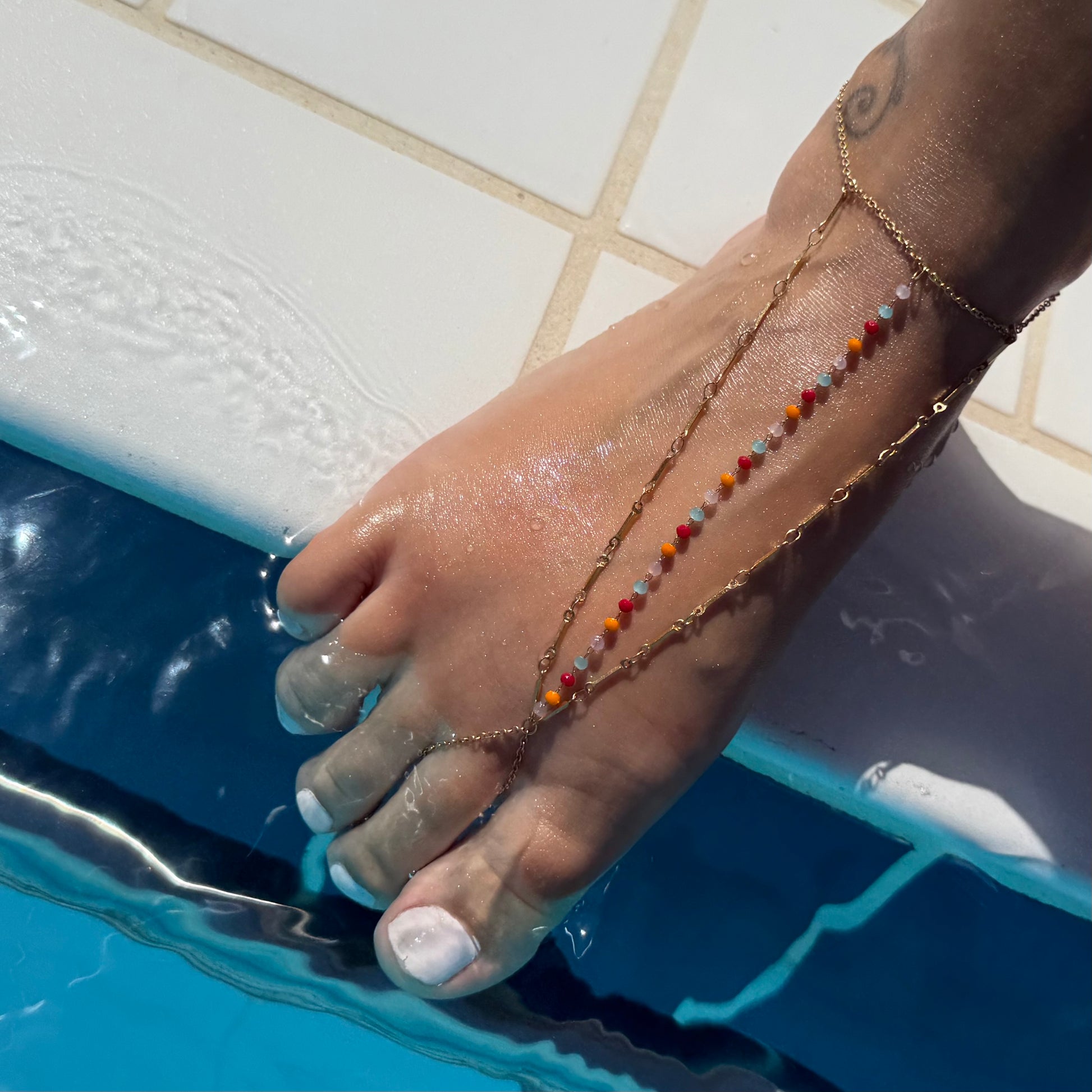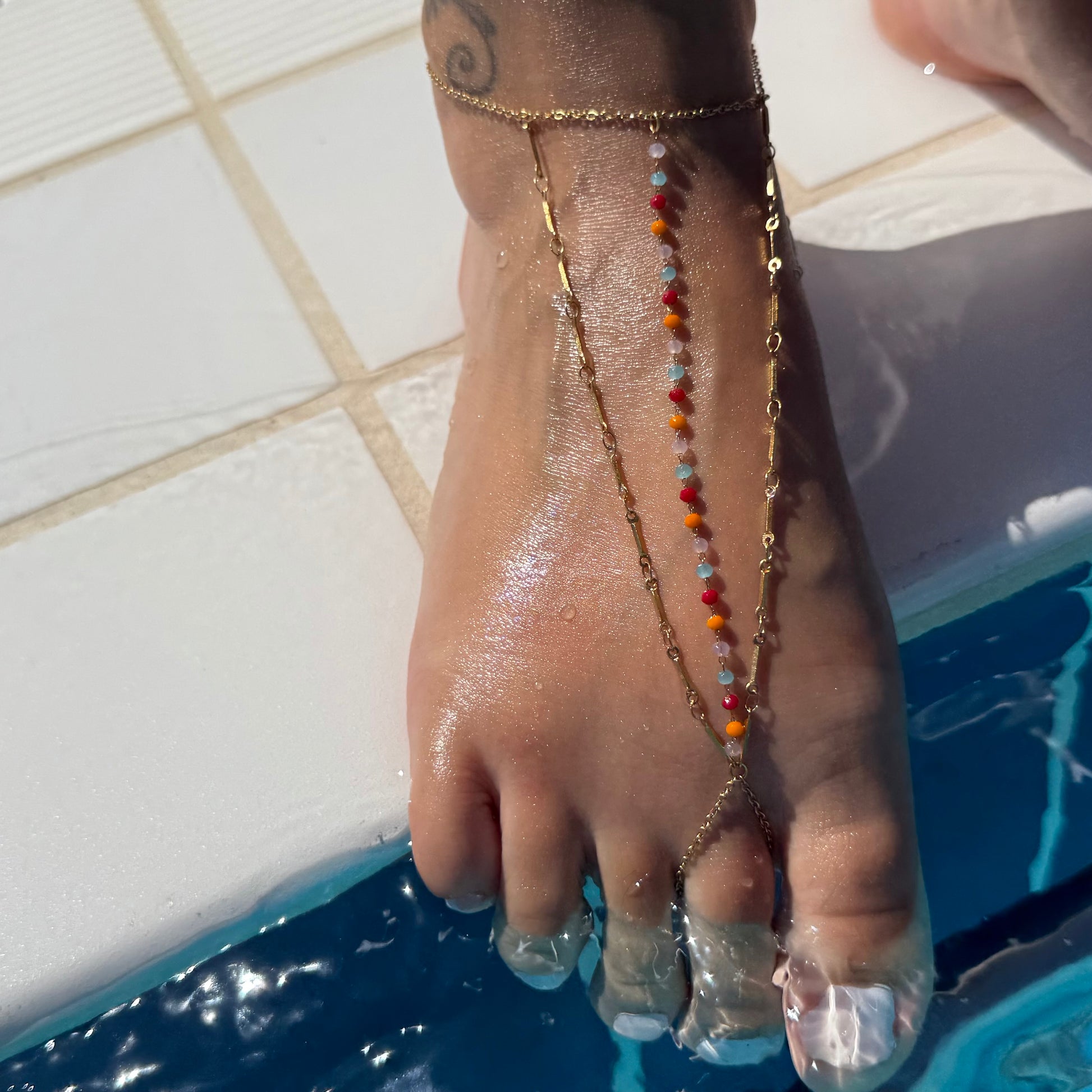 Bijou de pied composé de 3 lignes graphiques dorées dont une en perles colorées, pour un rendu très estival.