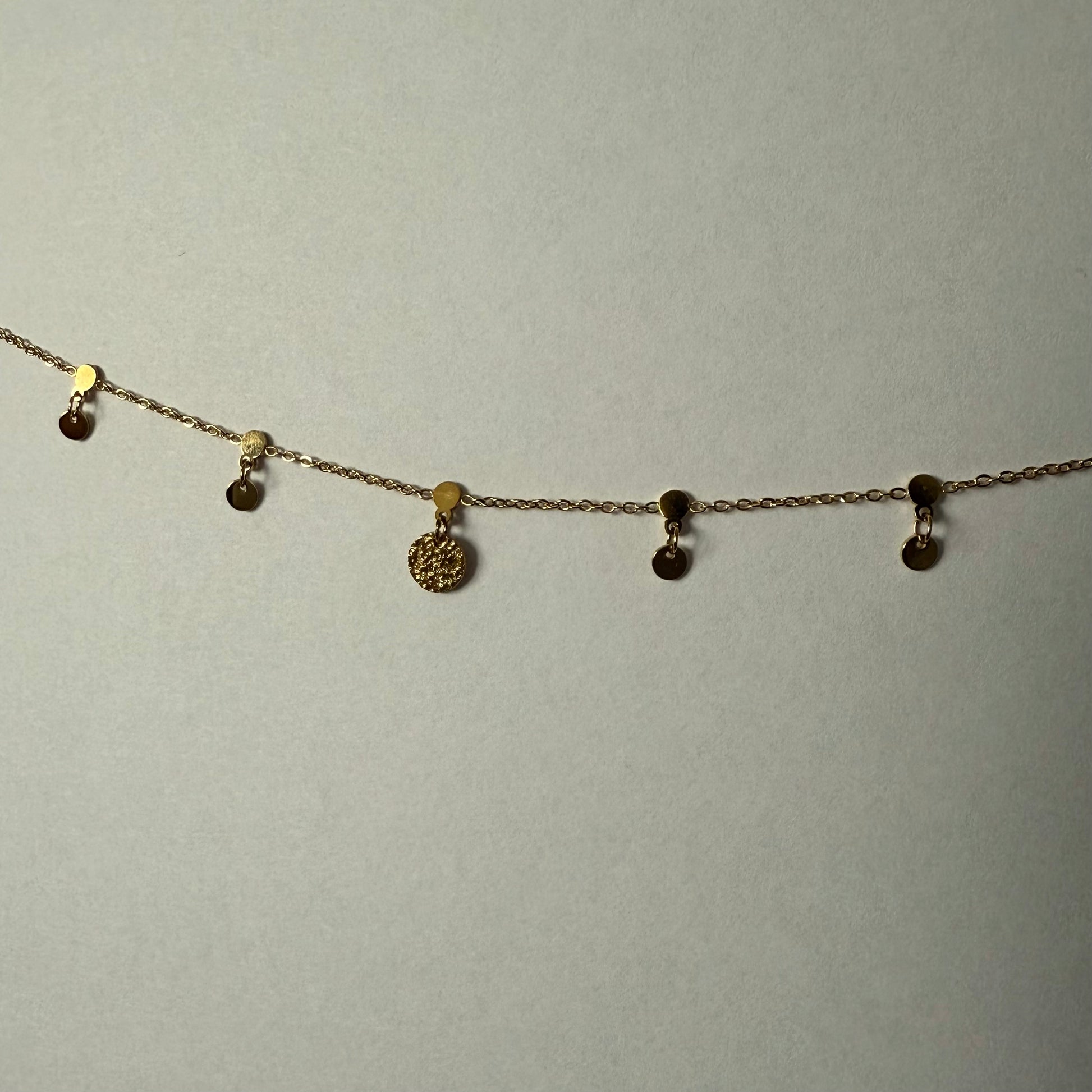 Chaîne de cheville avec 4 pampilles rondes et lisses et 1 pampille un peu plus grande martelée au centre.
