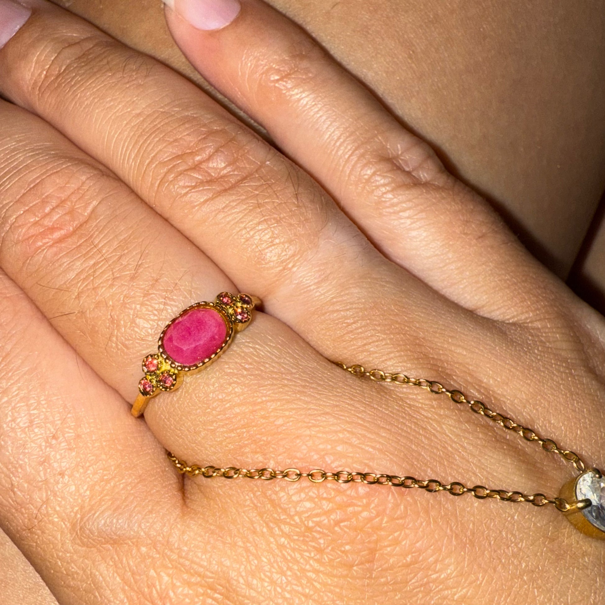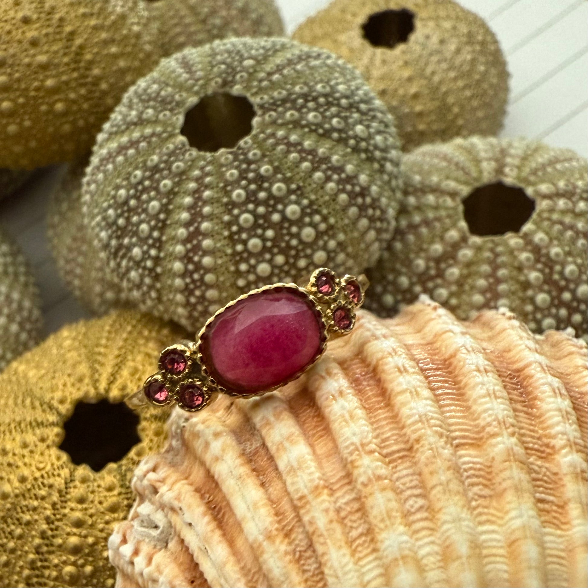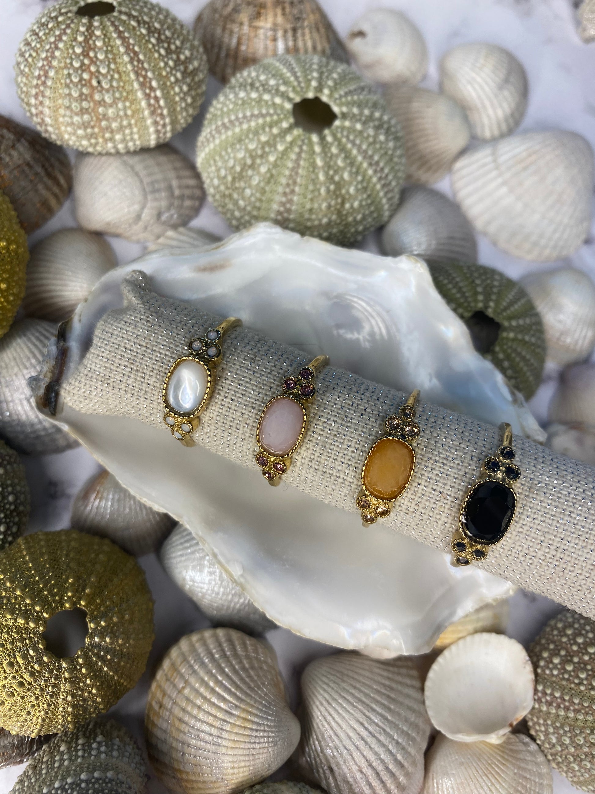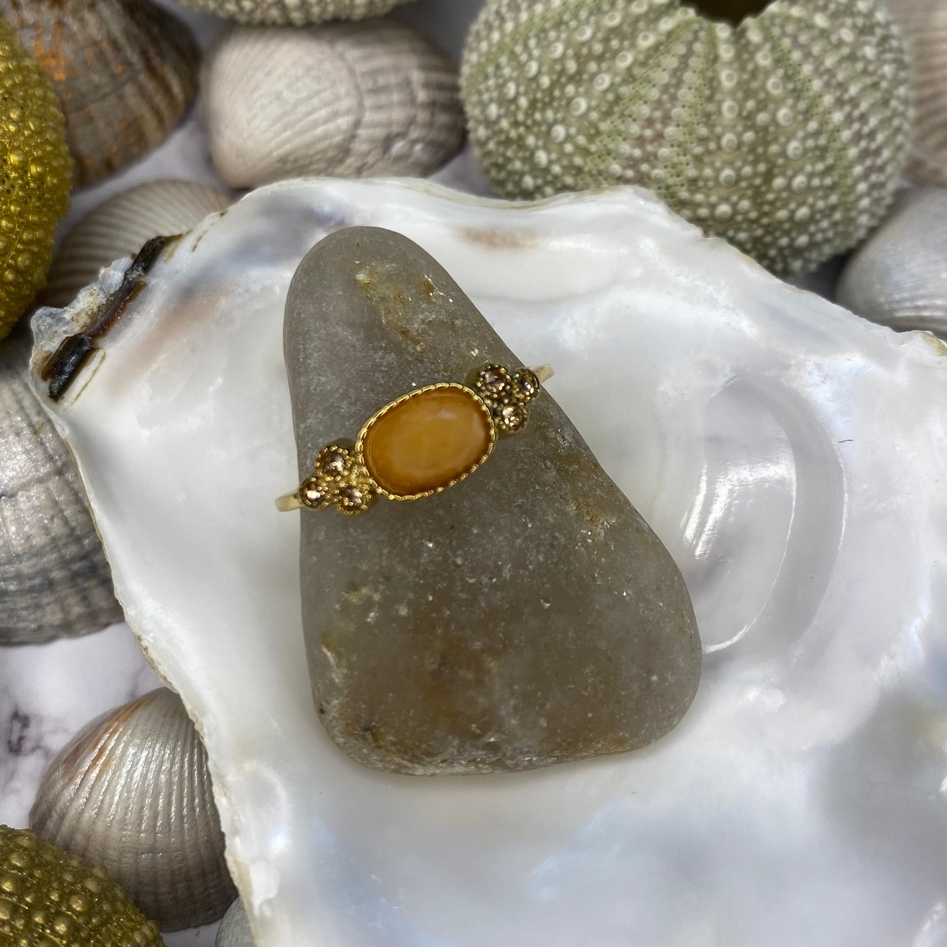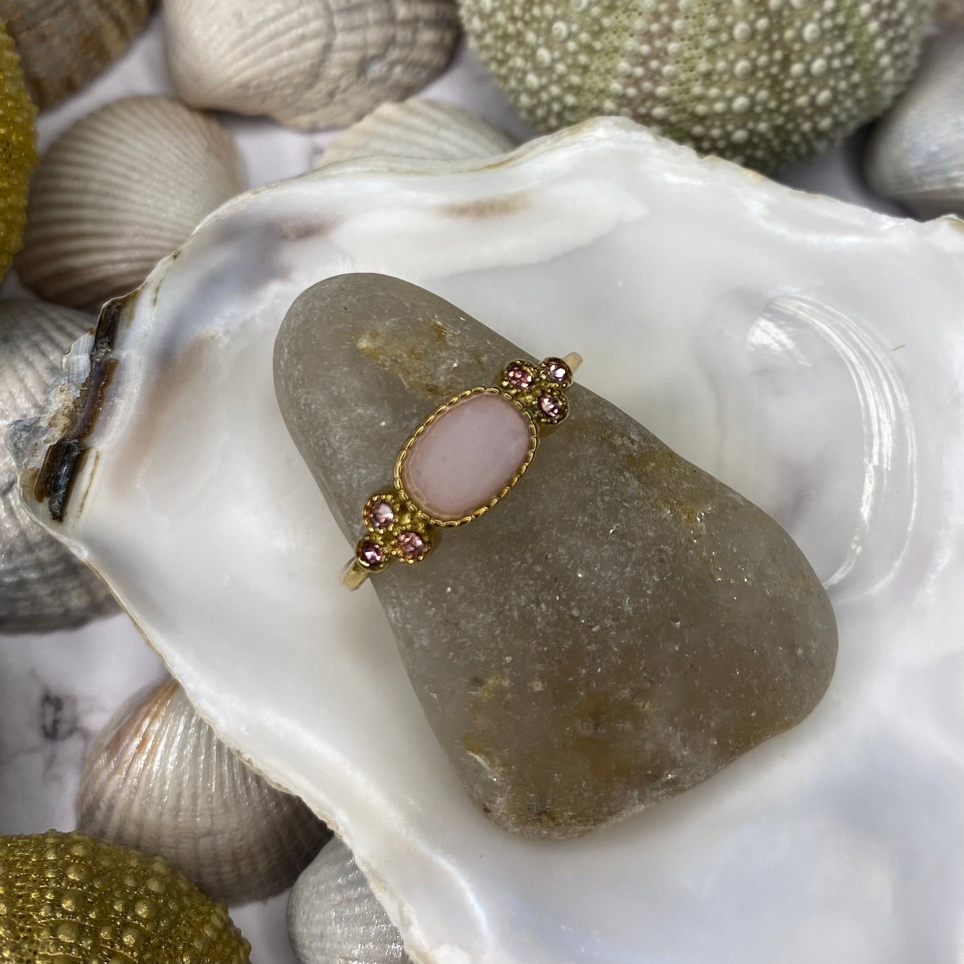 Pierre naturelle ovale, entourée par 3 petites pierres de part et d’autres dans les mêmes coloris.