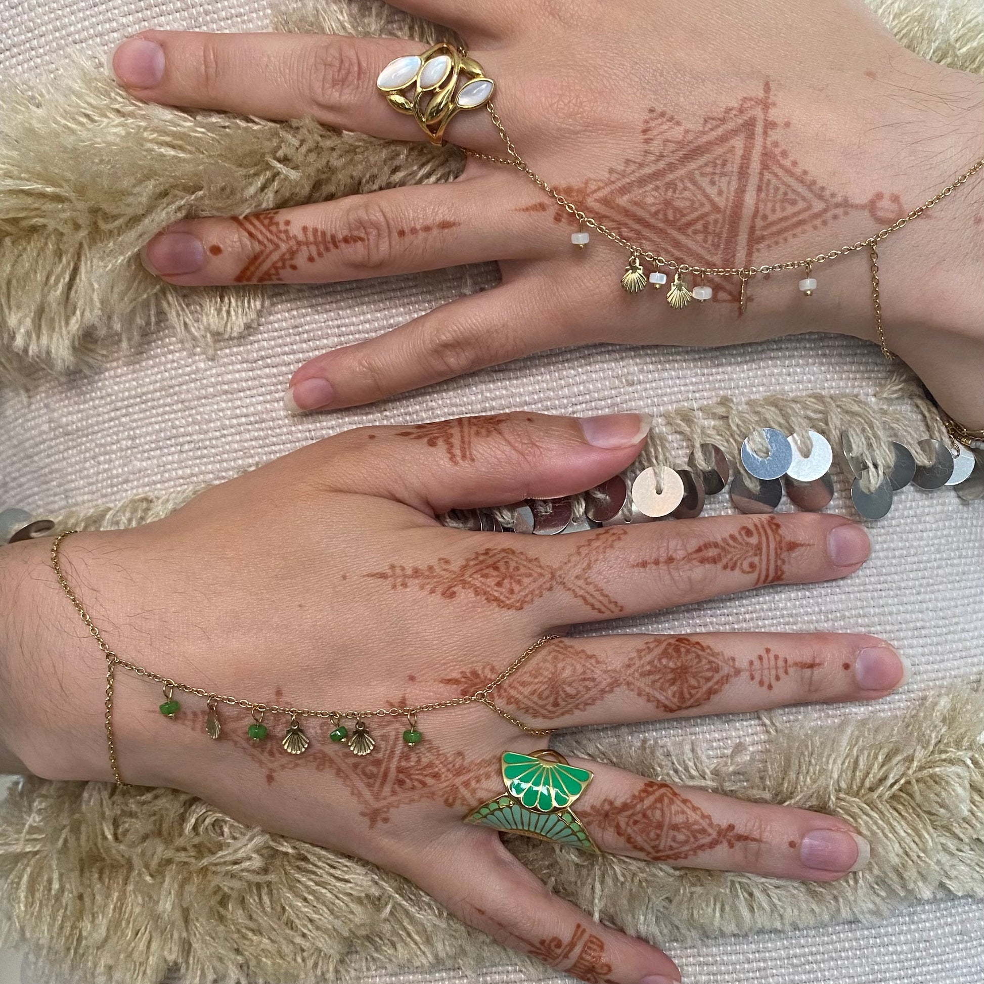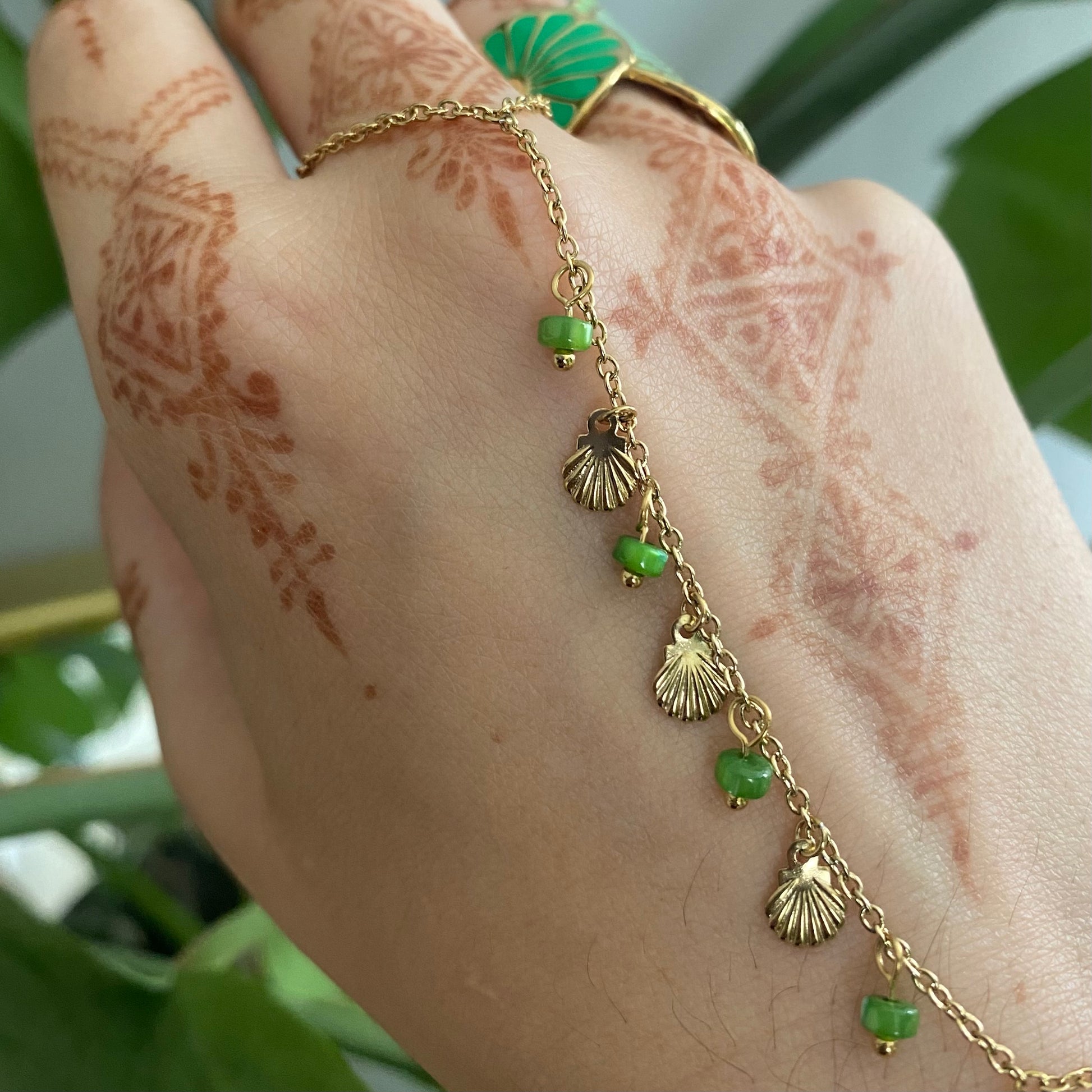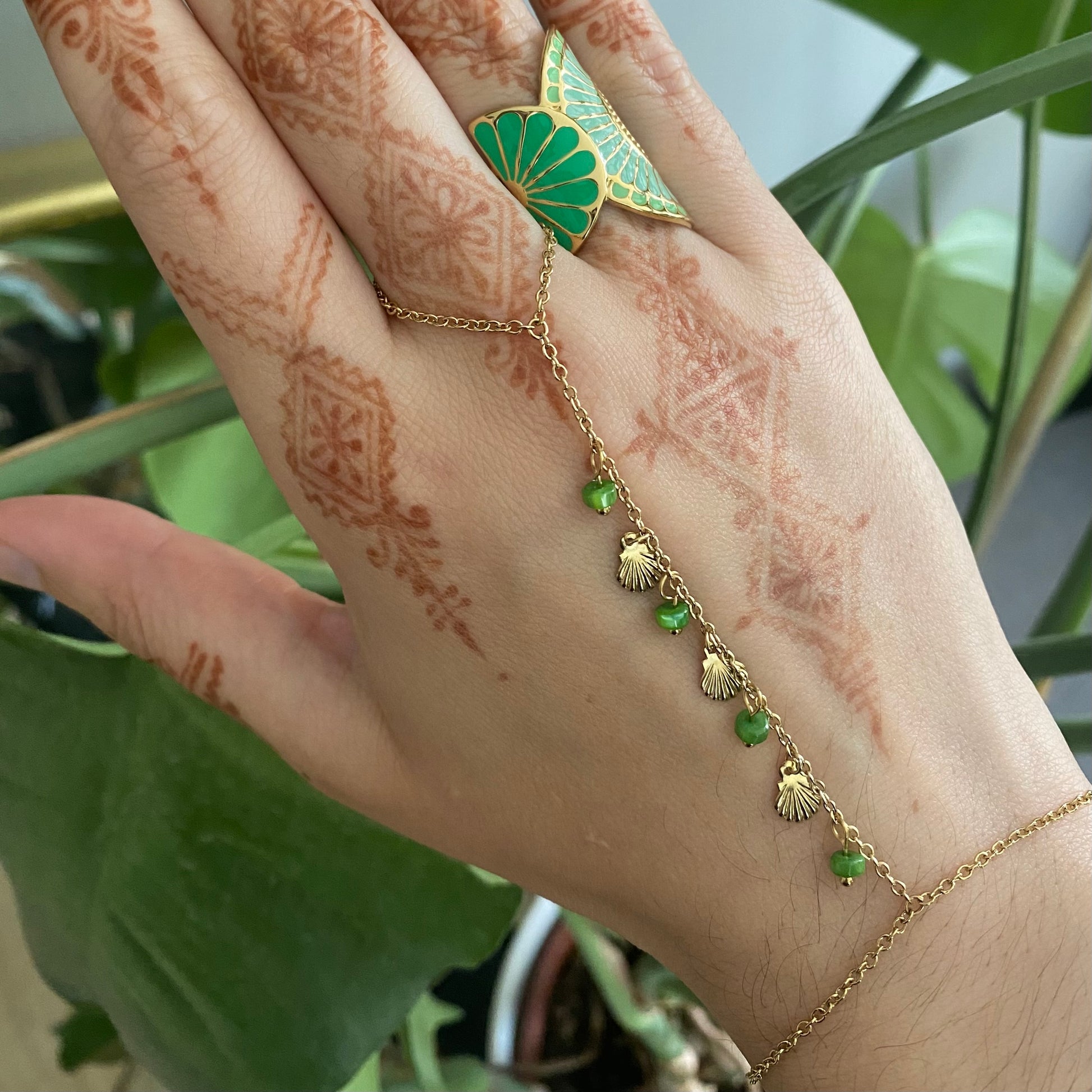 Bijou de main en acier inoxydable embelli par des coquillages dorés et perles vertes.