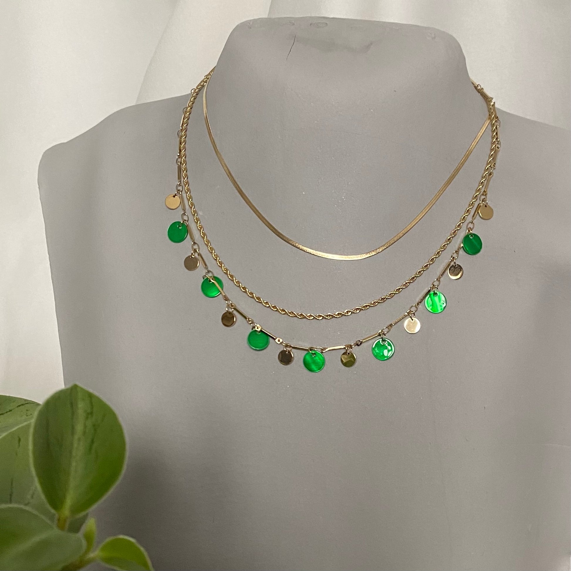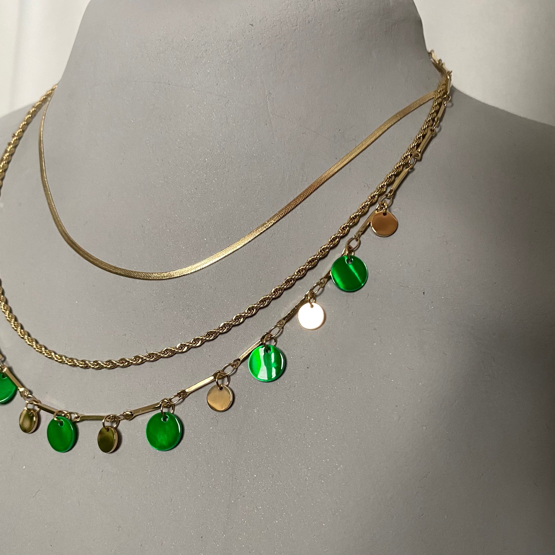 Collier 3 rangs composé d’une chaîne plate, d’une chaîne torsadée et d’une chaîne fine agrémentée de petits disques de nacre colorée.