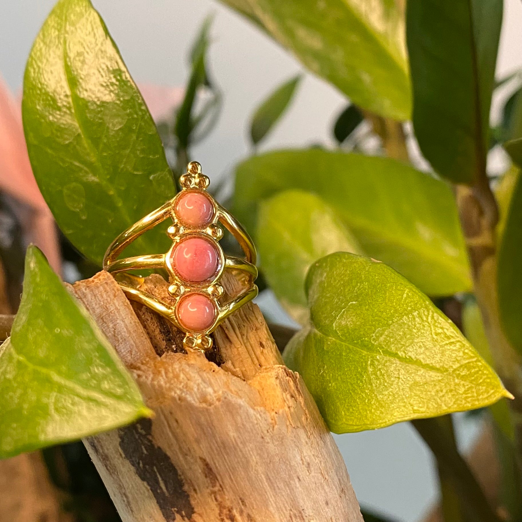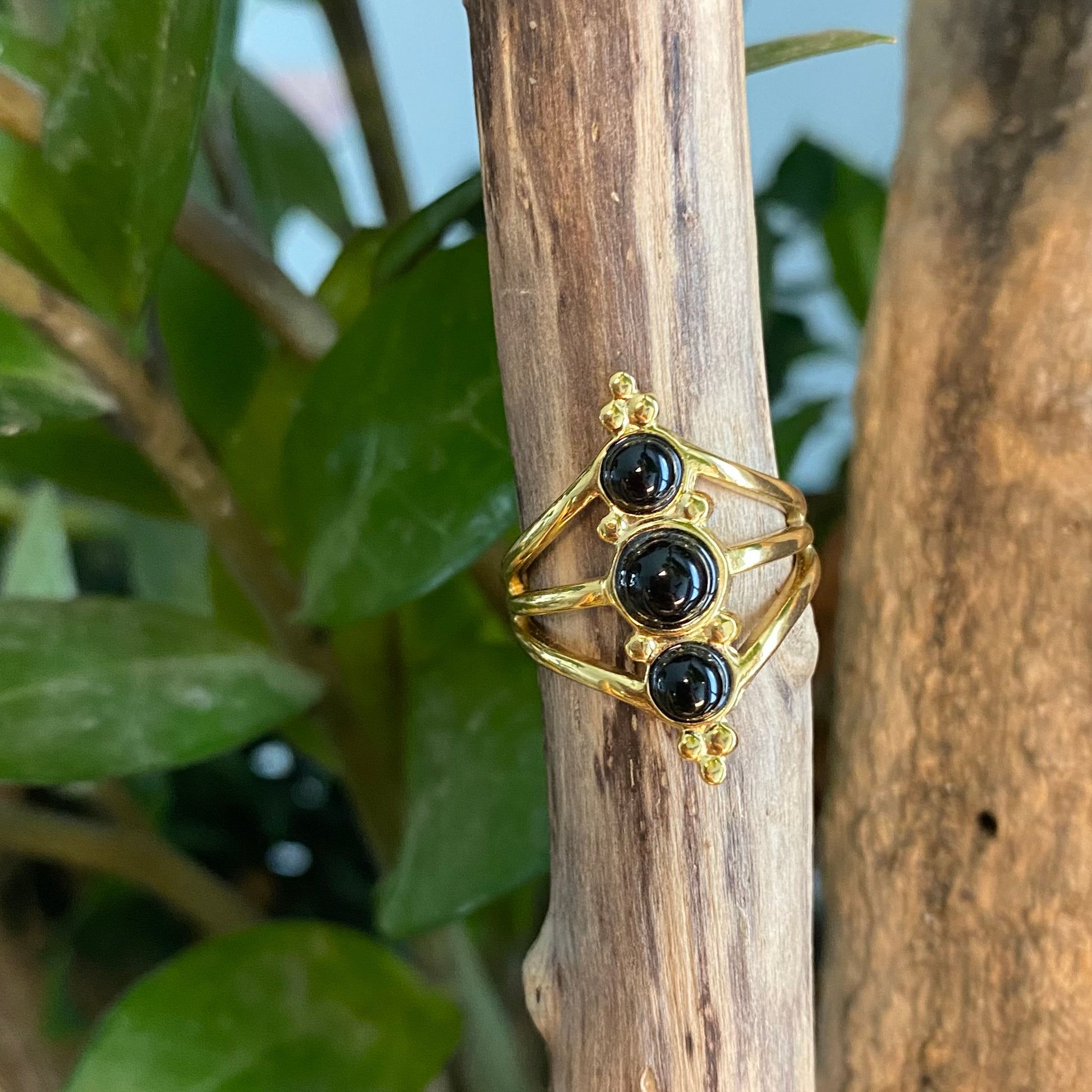 Bague de couleur dorée avec 3 pierres de couleur.