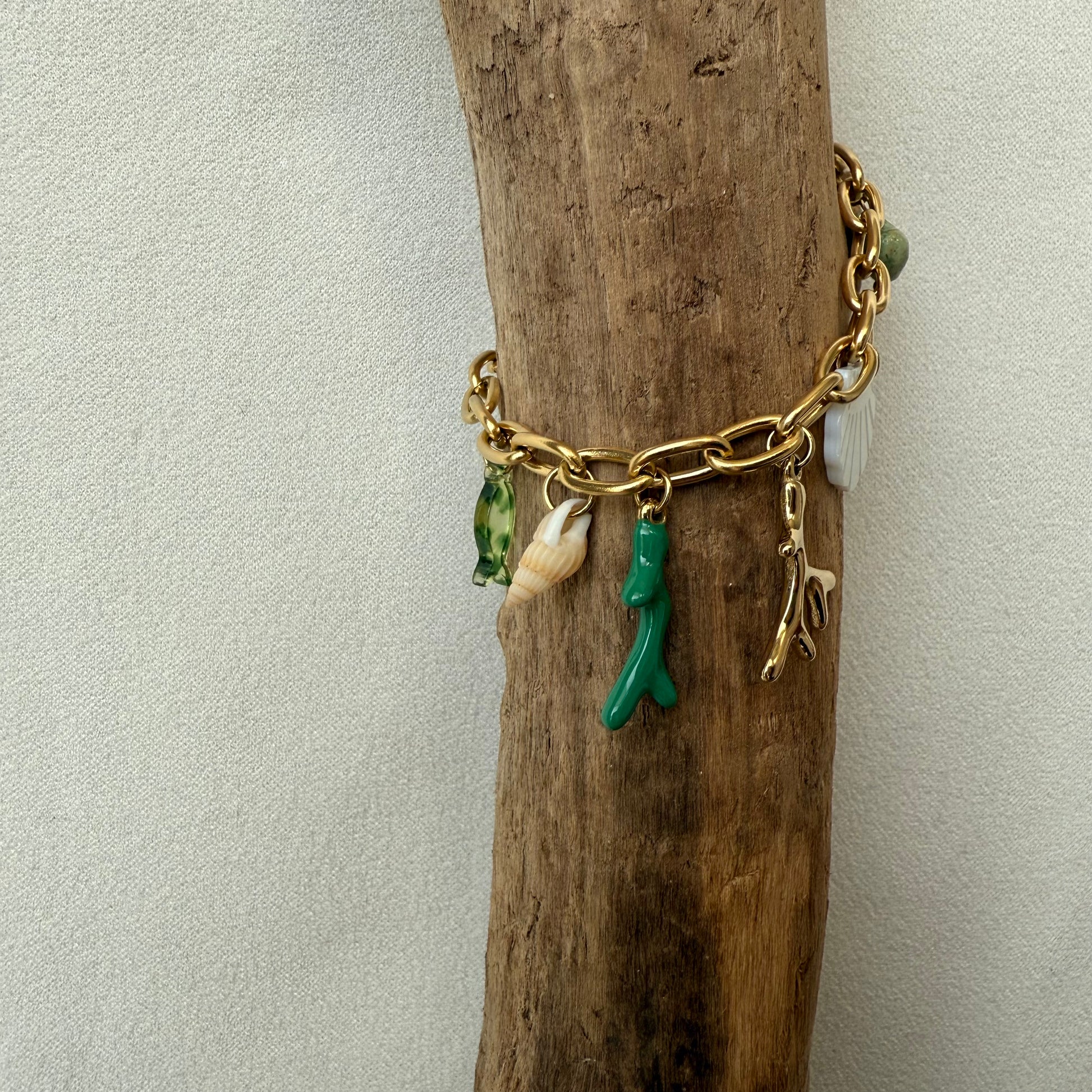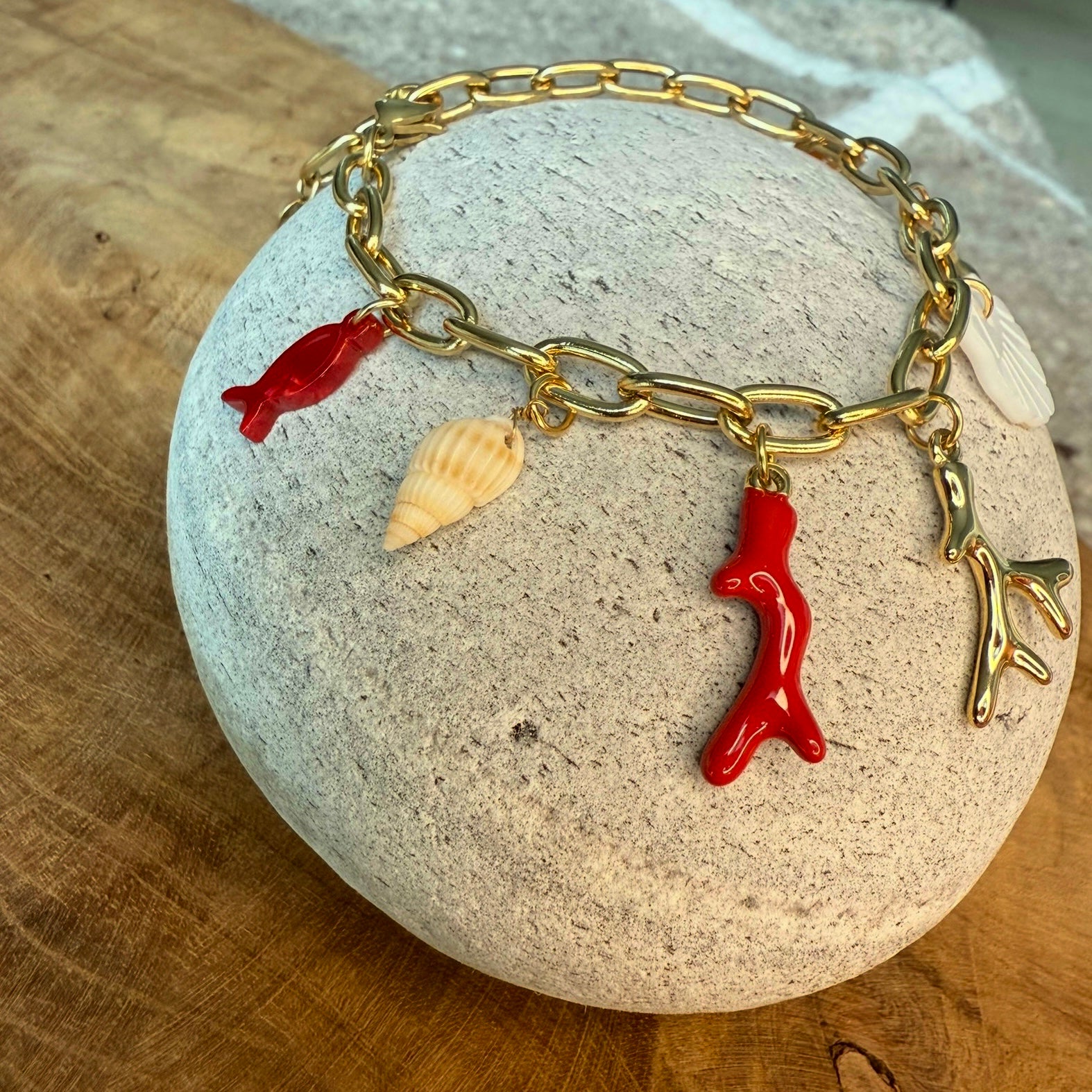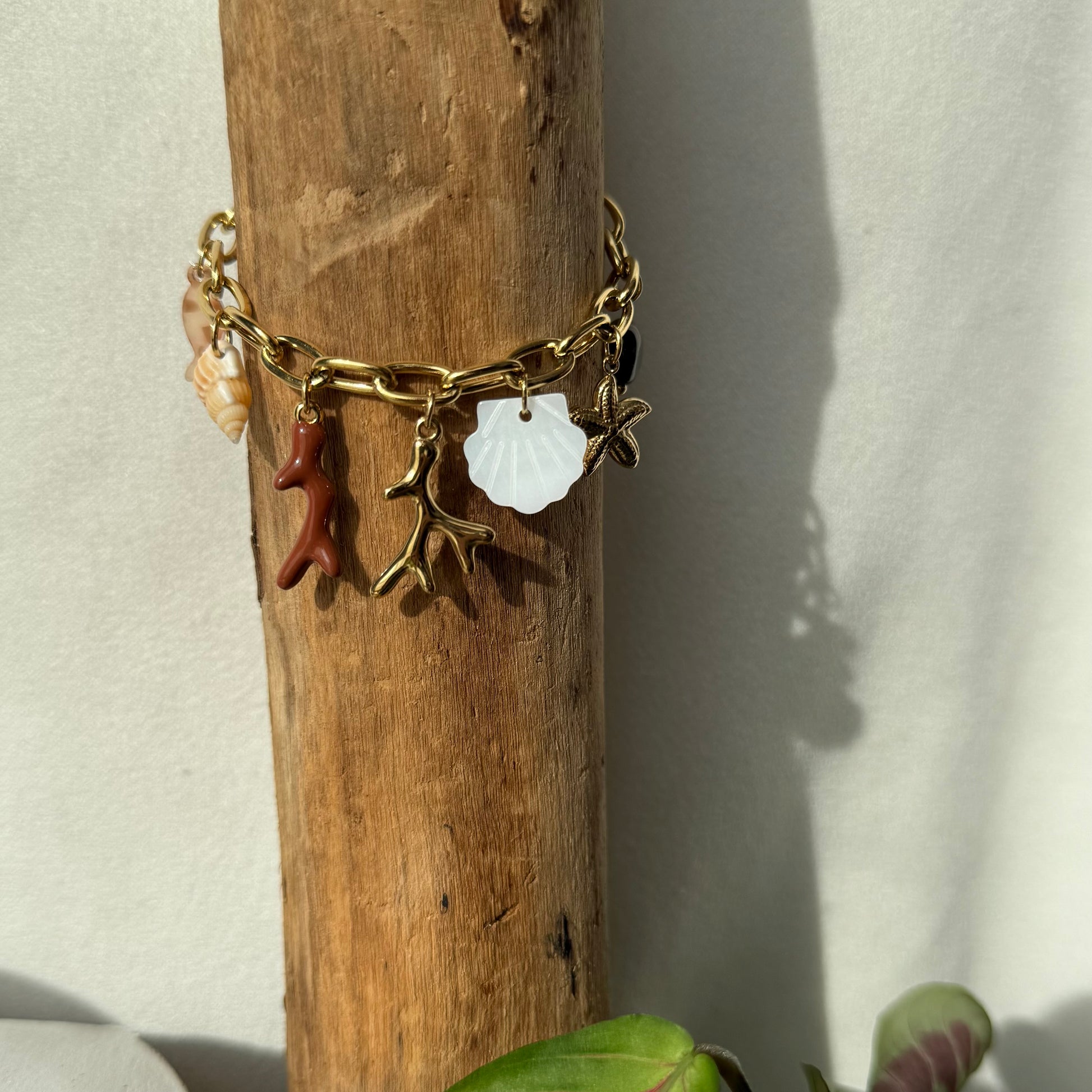 Découvrez le charme des vacances à la mer avec notre bracelet Trois-Rivières! Les nombreux pendentifs en forme de coquillages, poissons et coraux ajoutent une touche d'élégance et de simplicité à votre look. Un accessoire parfait pour vous rappeler des souvenirs de voyage tout en étant tendance.