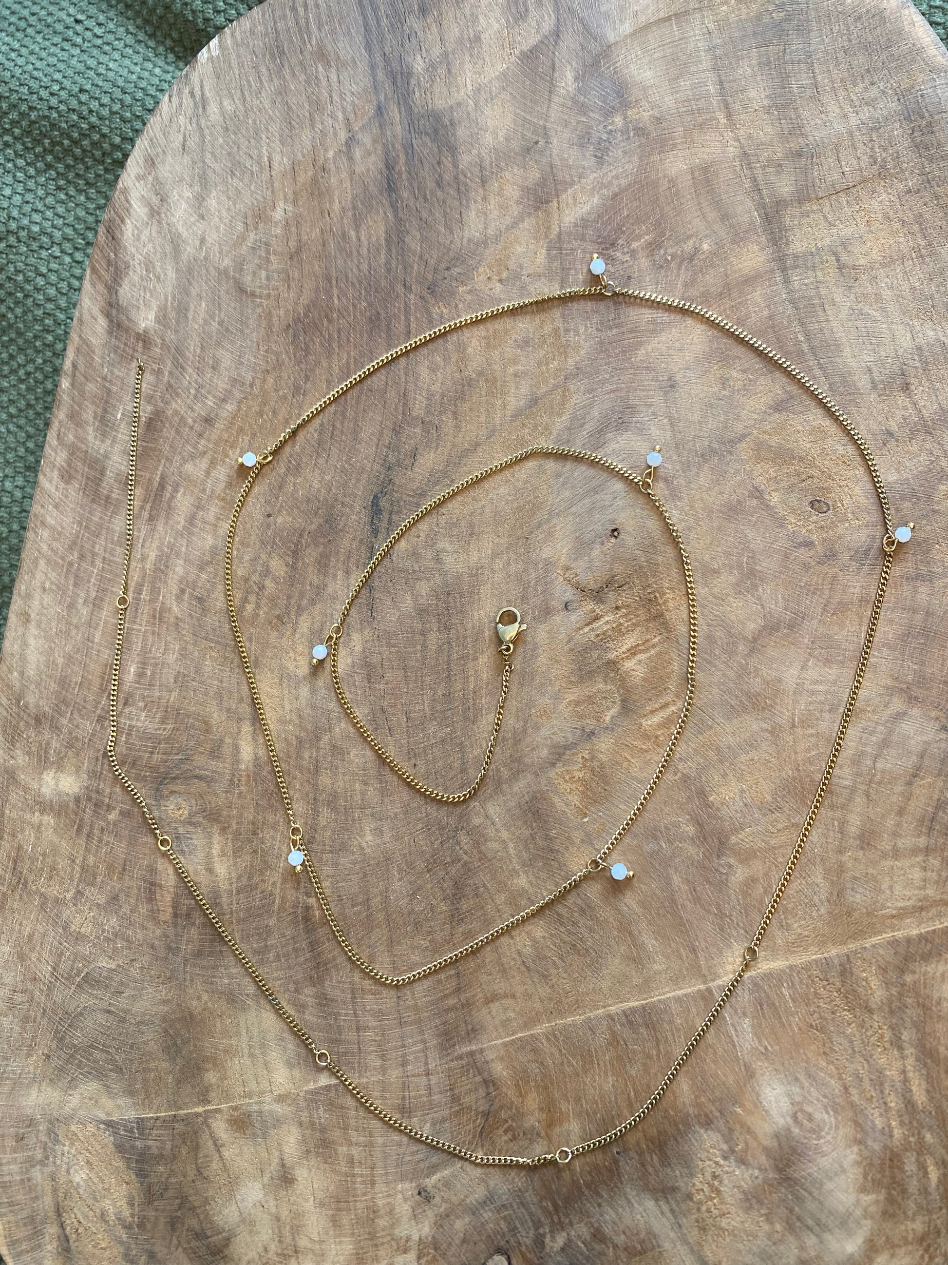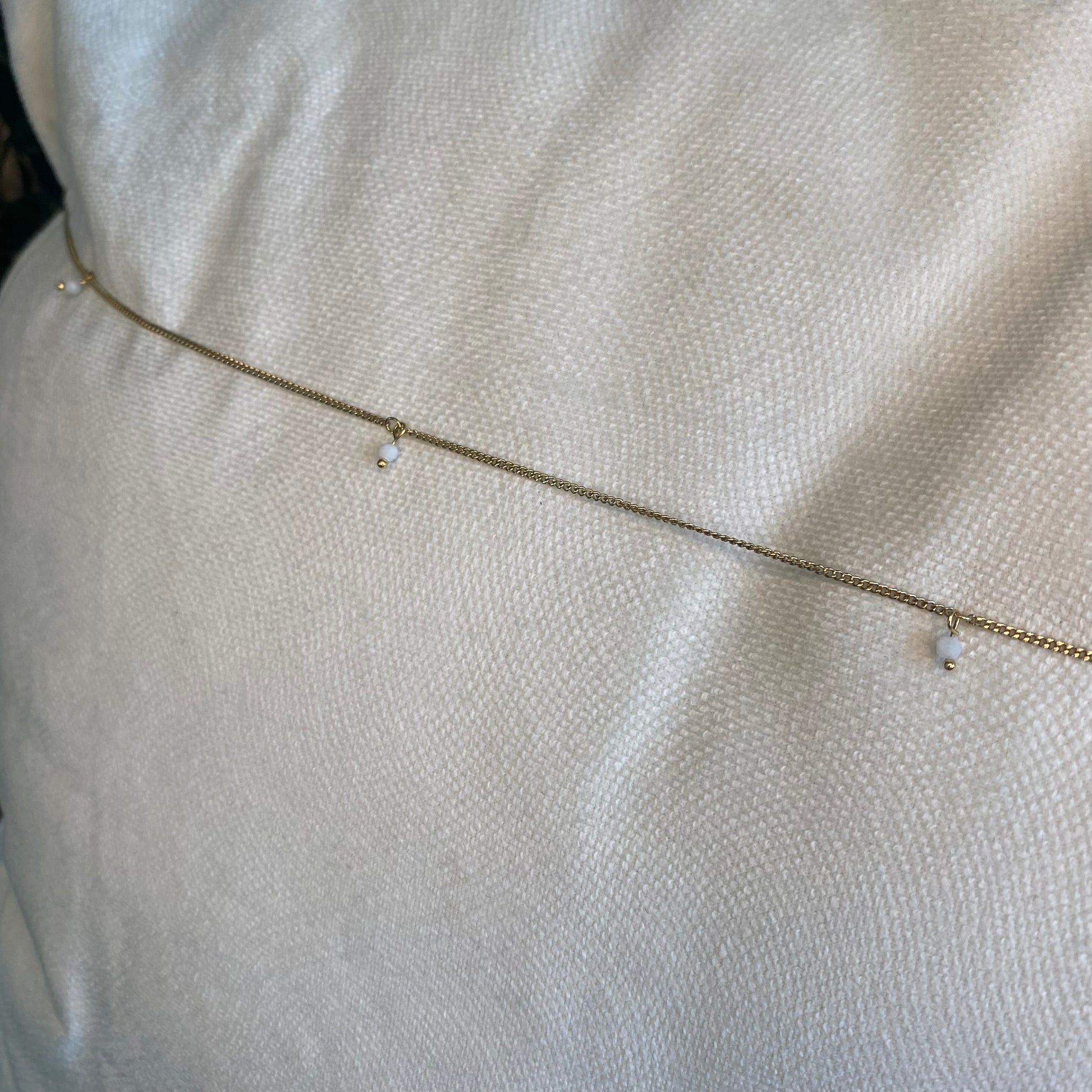Bijou de taille, maille simple avec perles blanches sur toute la longueur.
