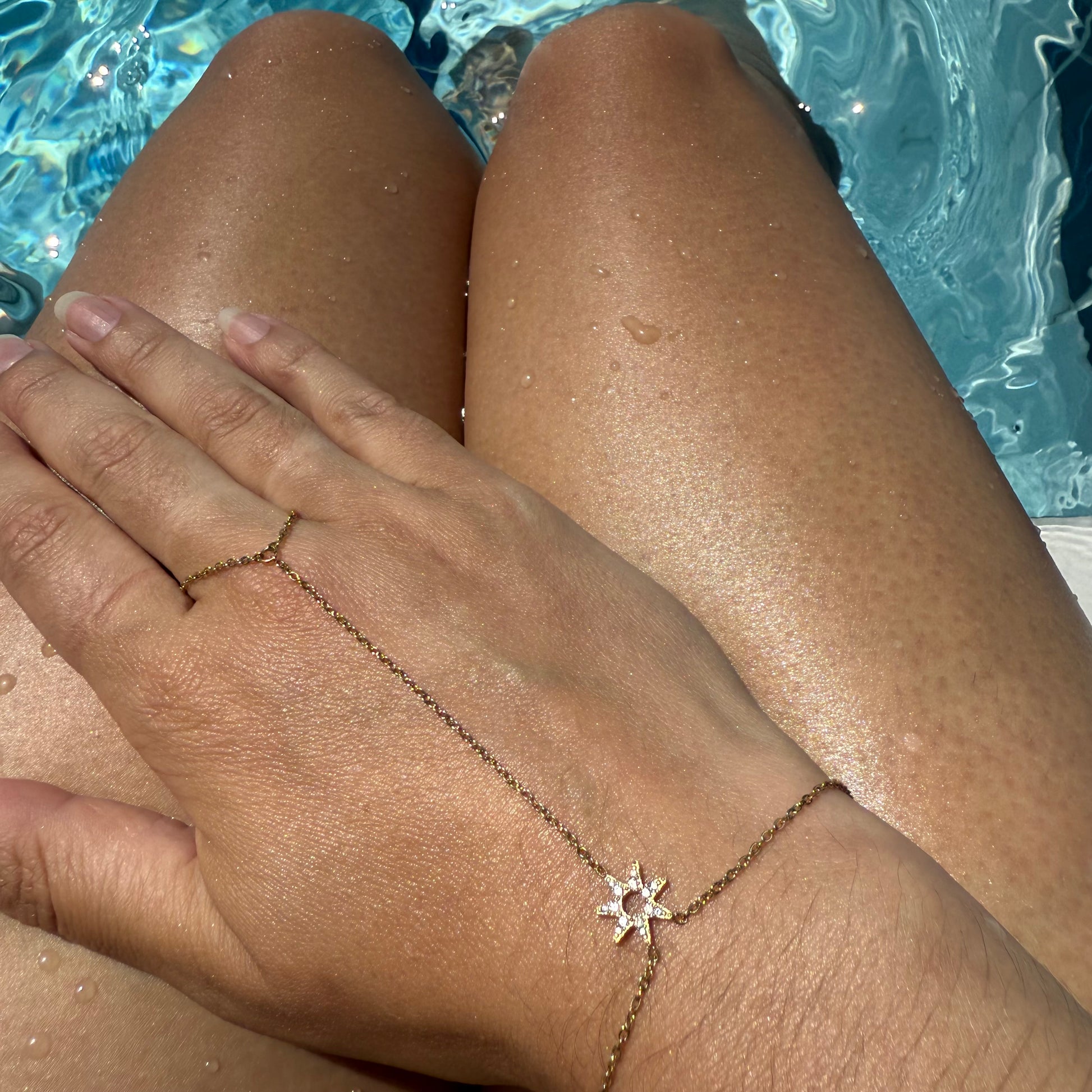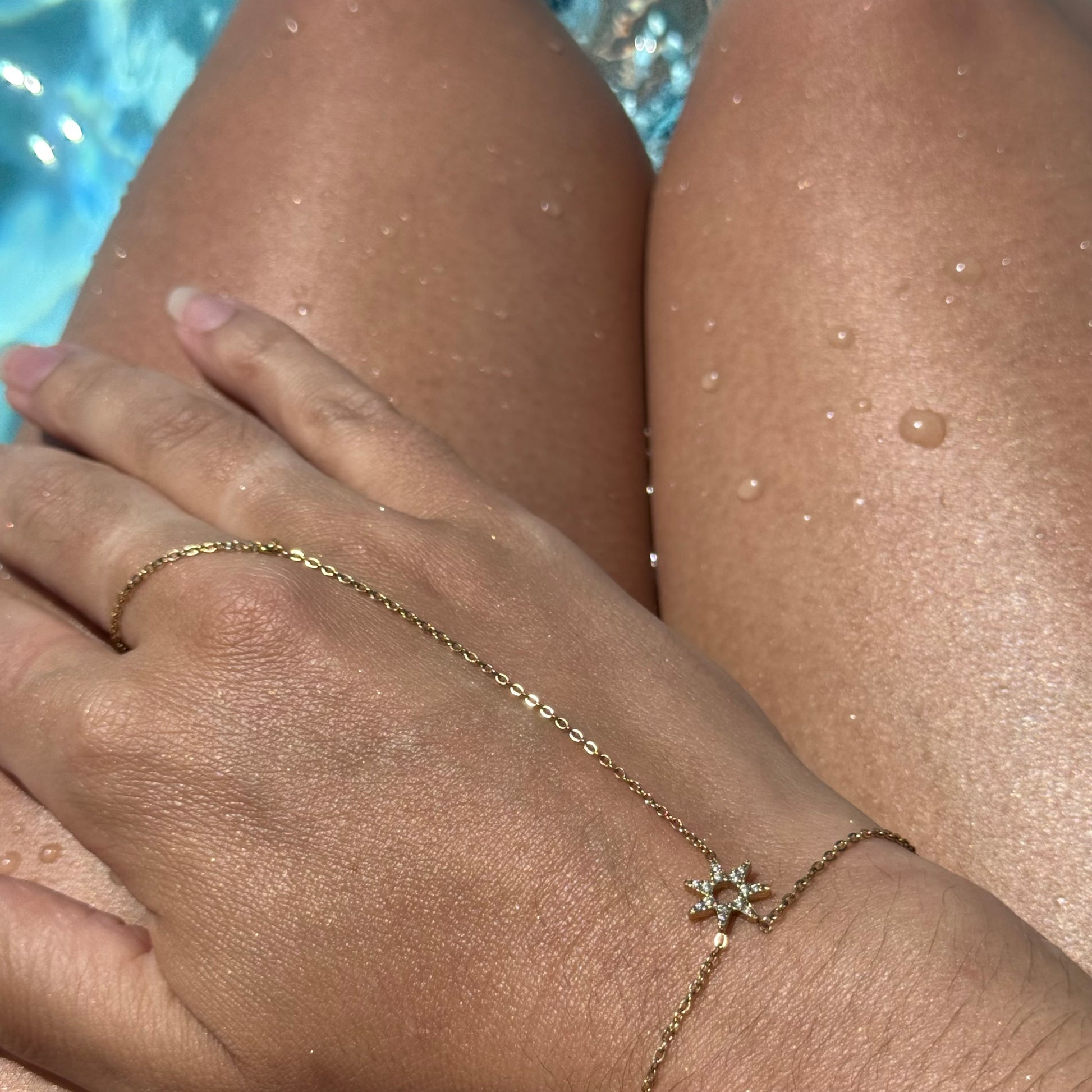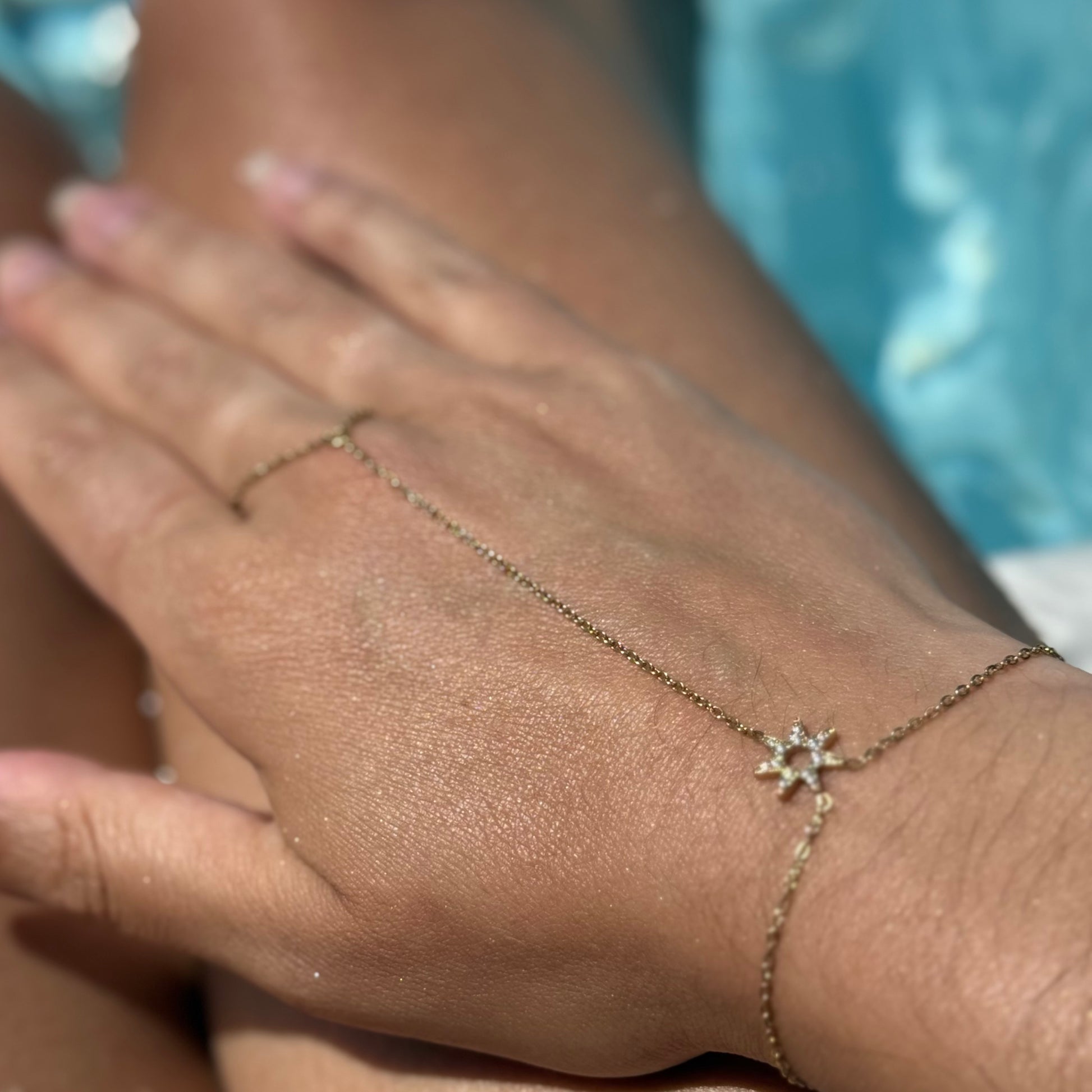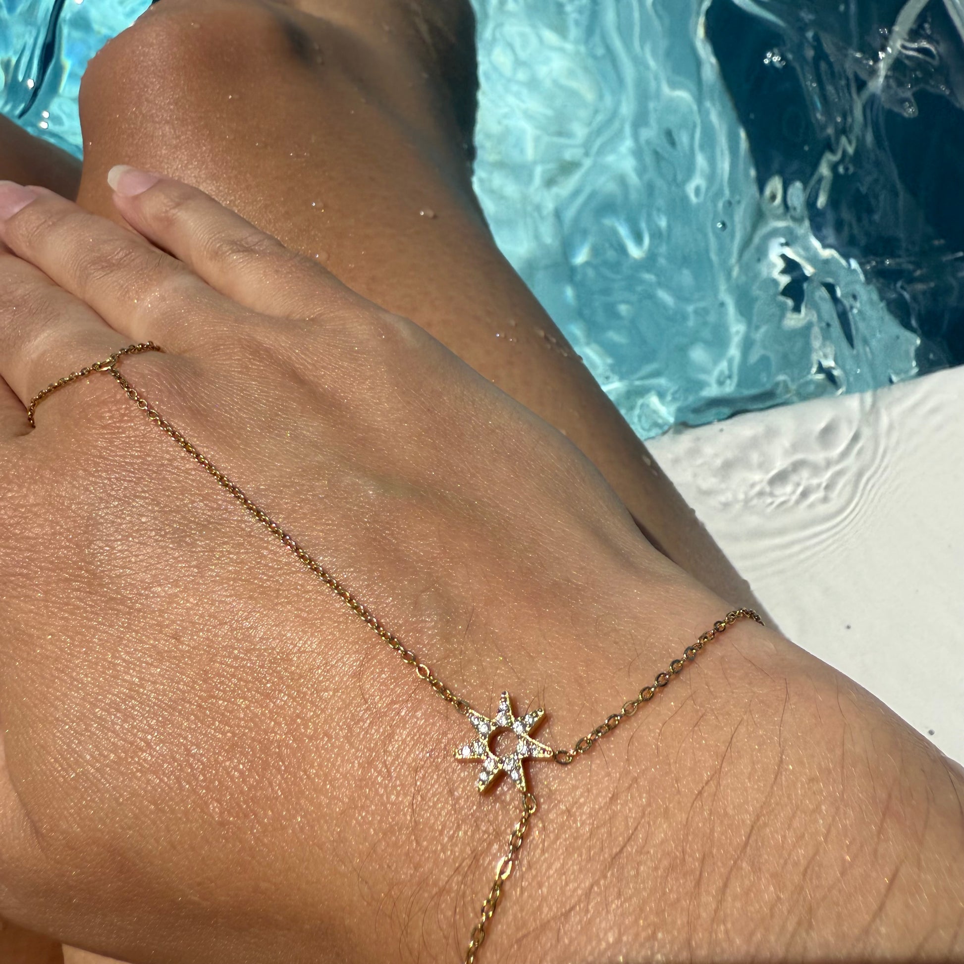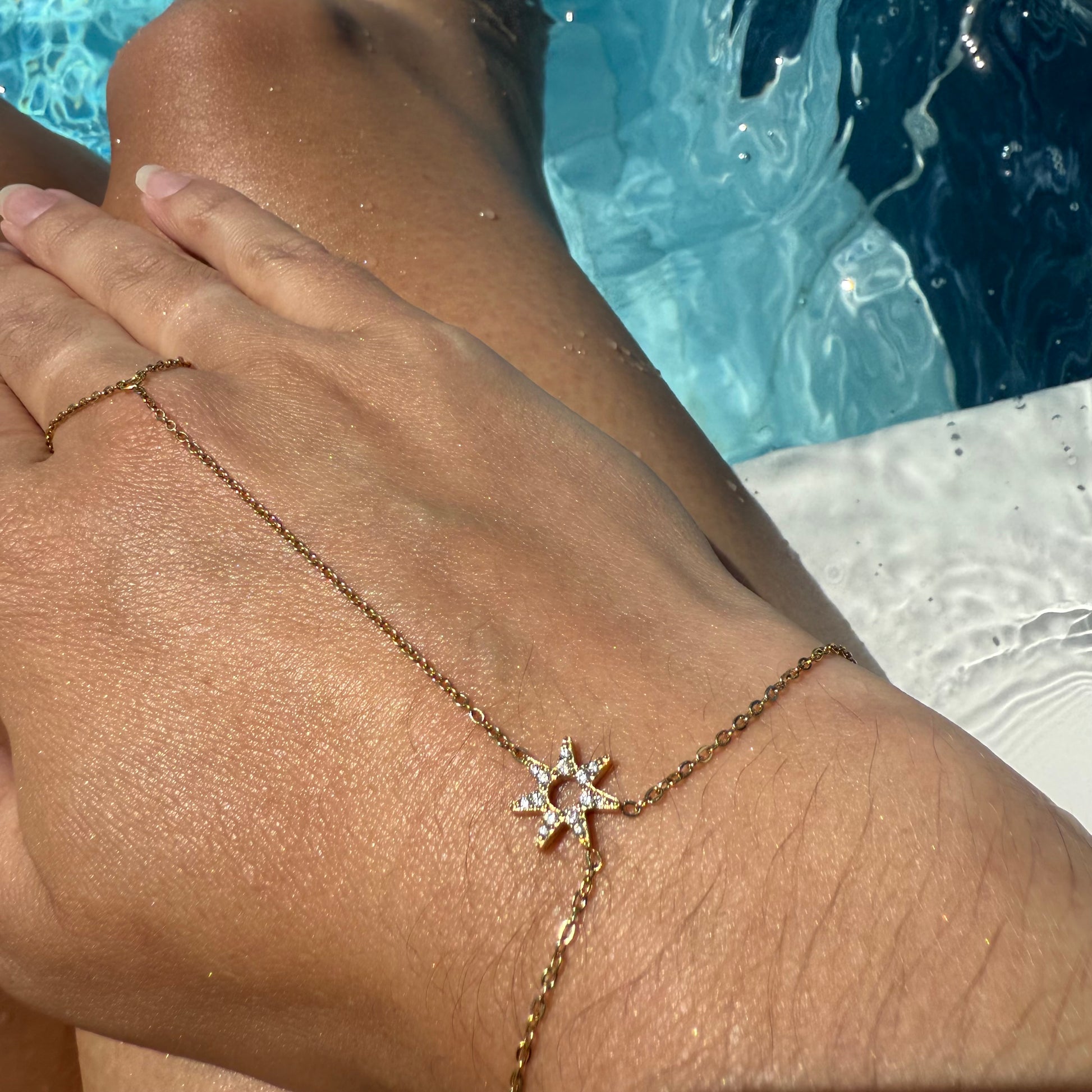 Bijou de main en acier inoxydable embelli par une rose des vents avec strass.
