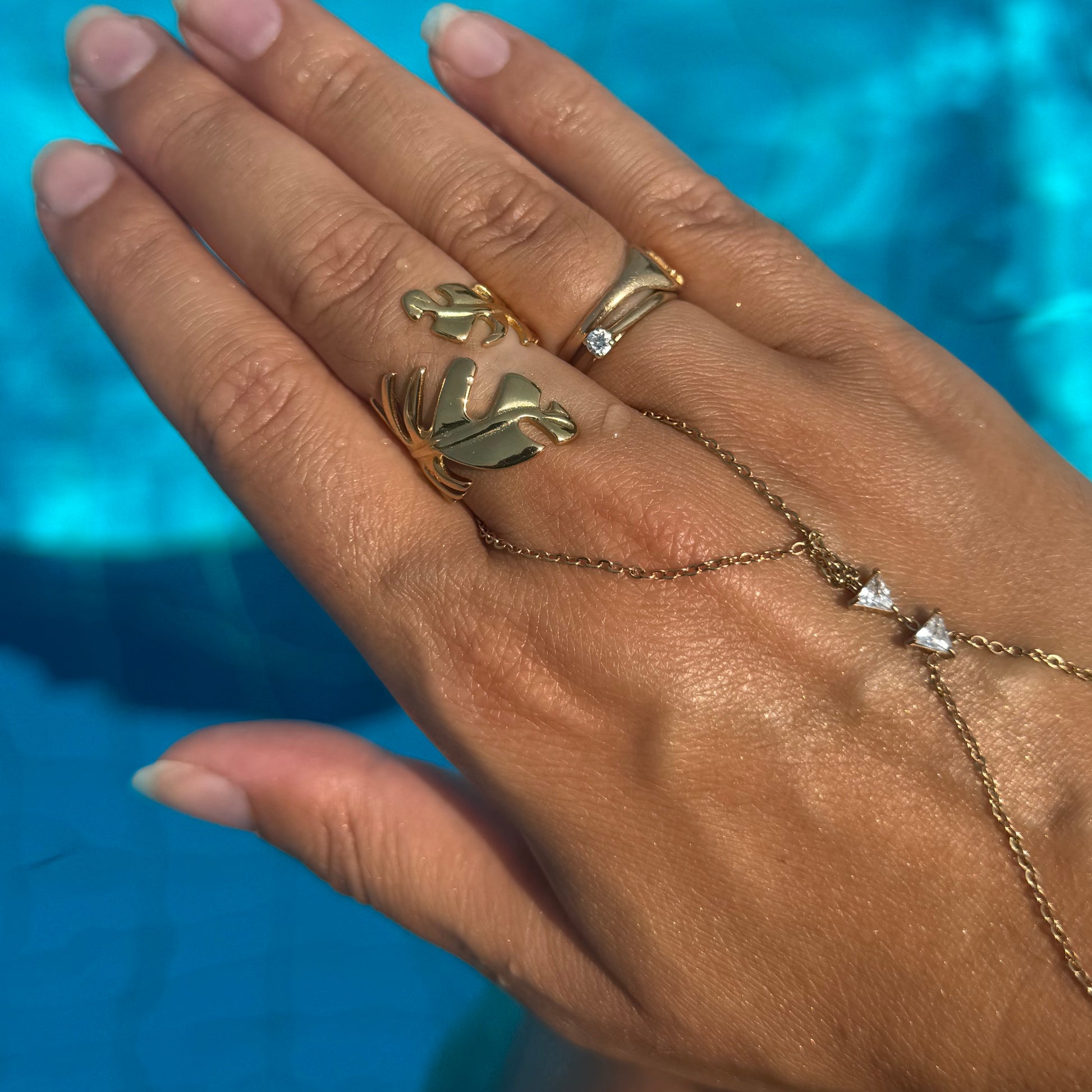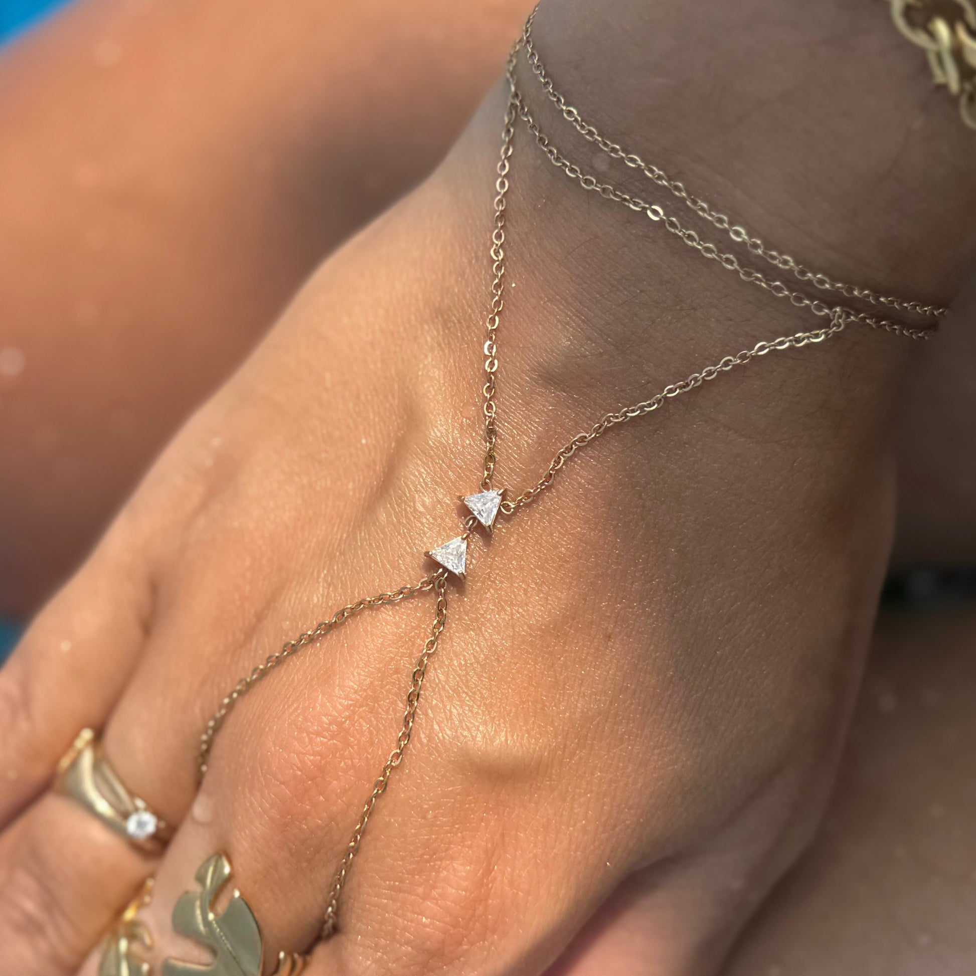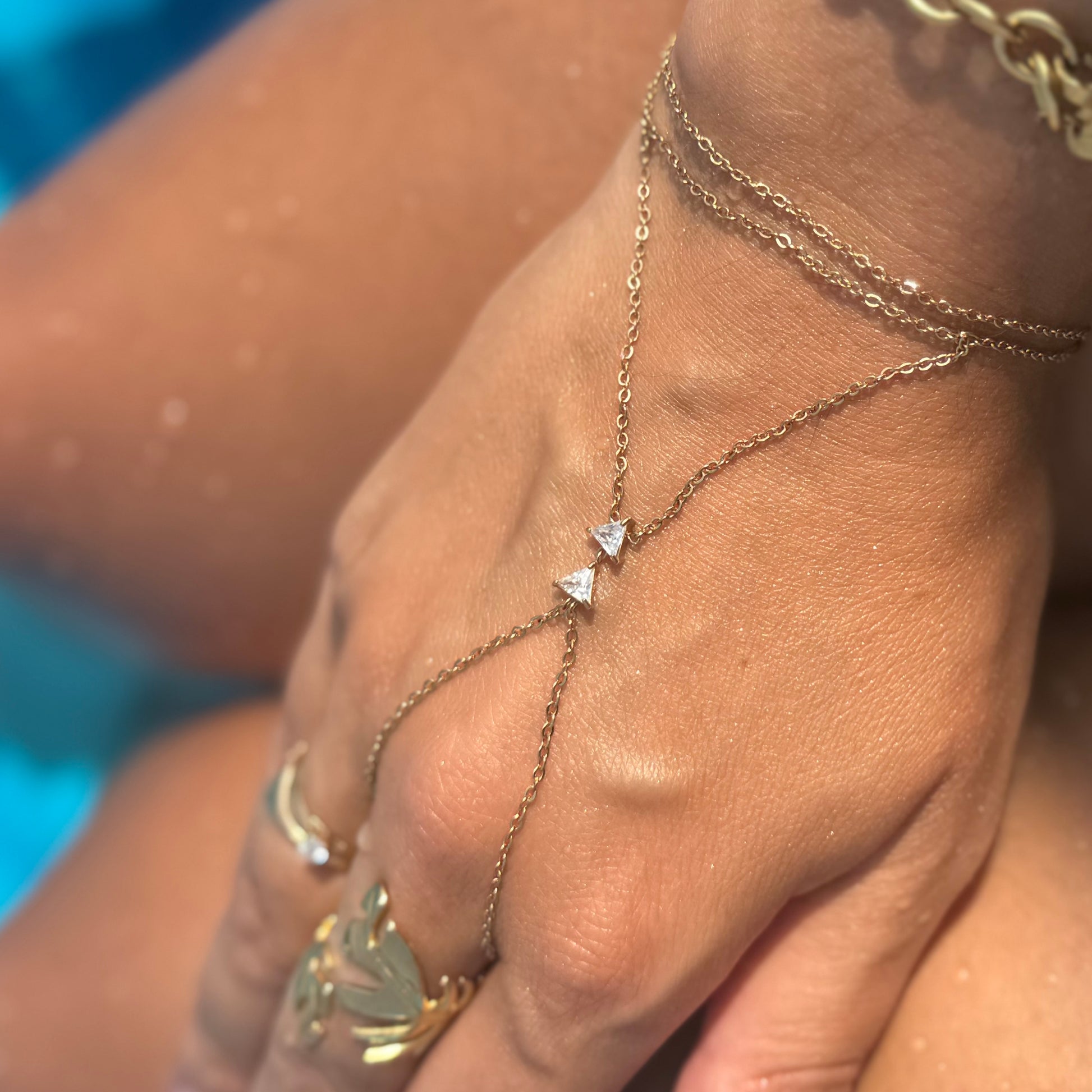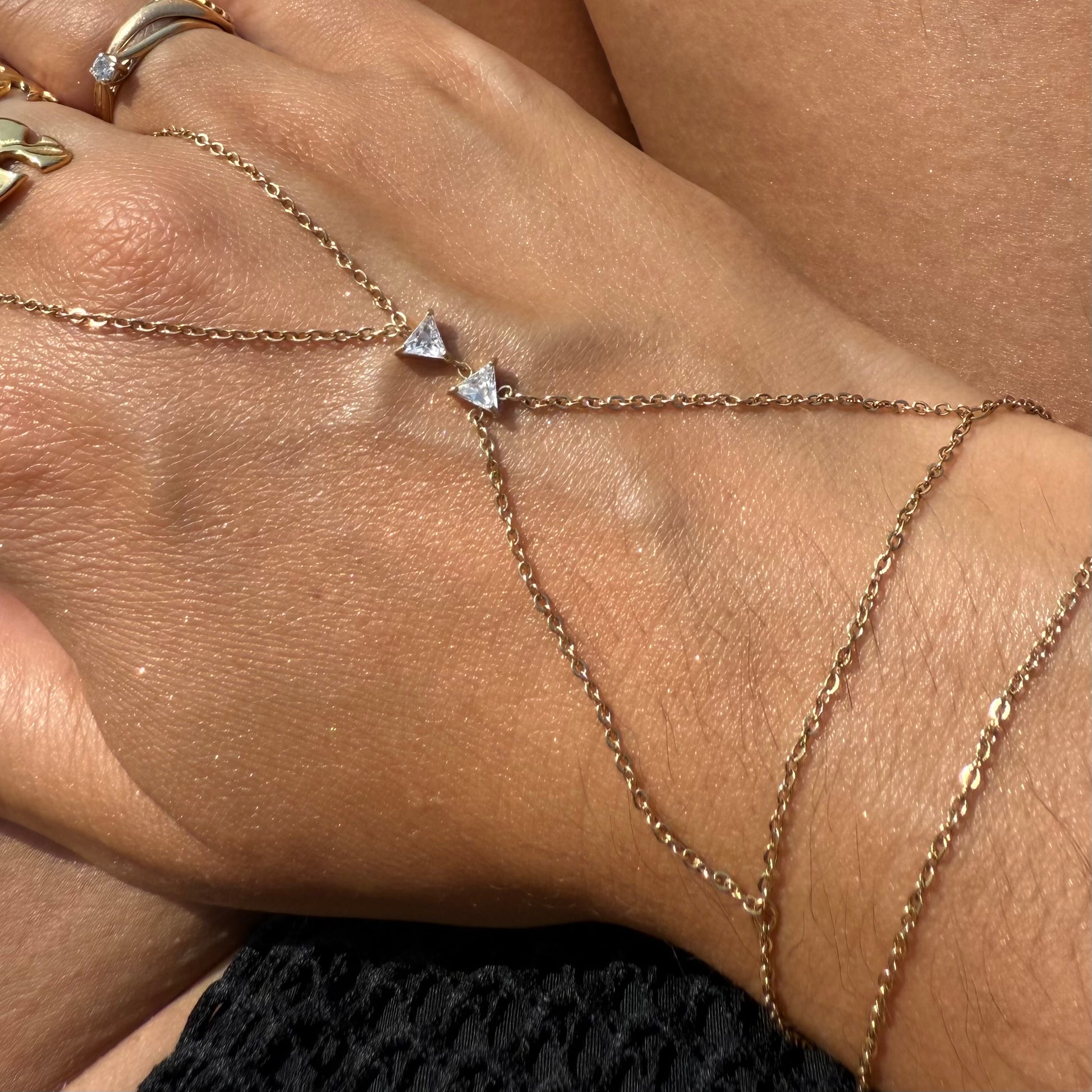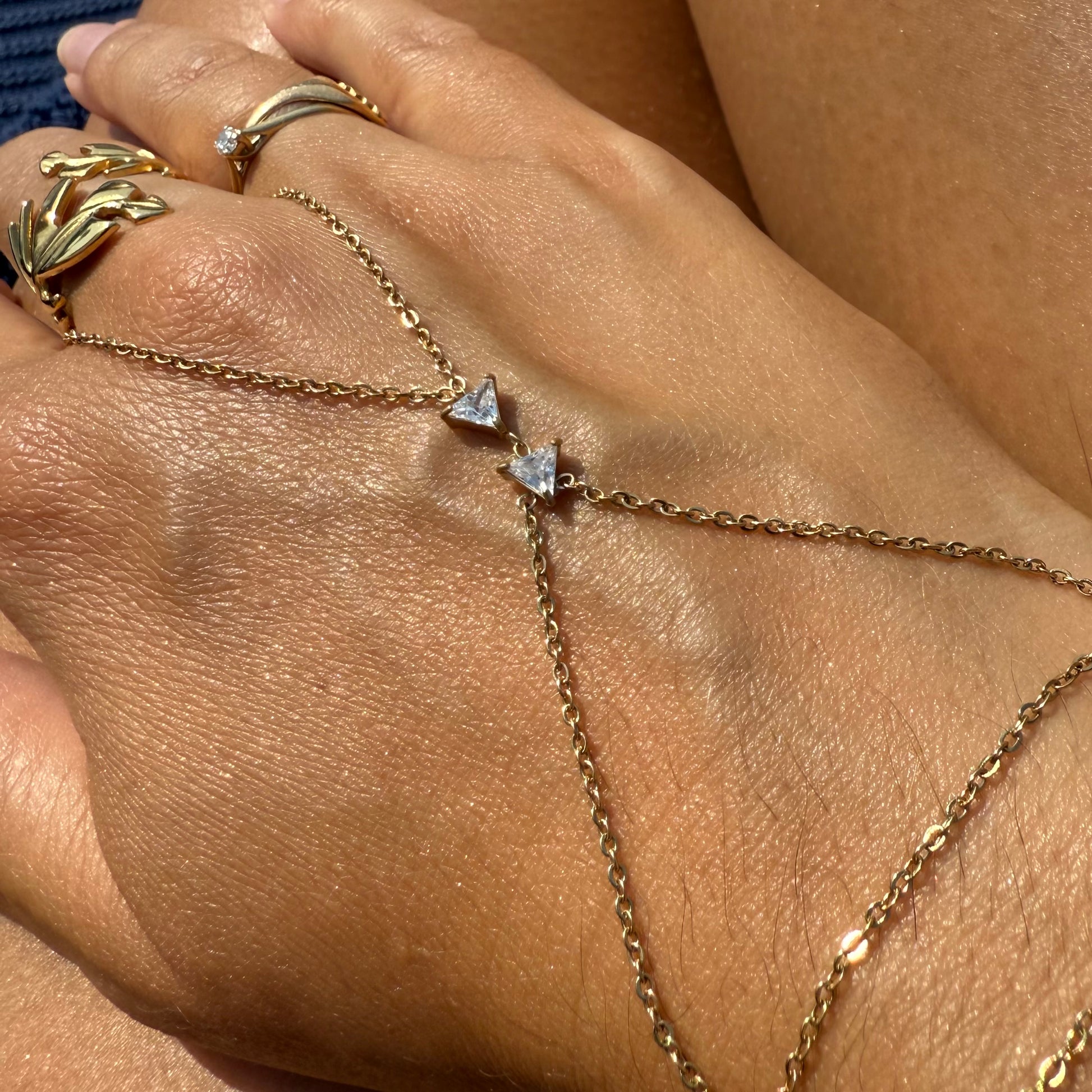 Le bijou de main Zaria est conçu avec deux strass en forme de triangle, ajoutant une touche de sophistication à votre main. Il se termine par un double bracelet. Ce bijou met en valeur l'élégance et la sensualité, offrant une option raffinée pour les occasions spéciales ou pour un quotidien éblouissant.
